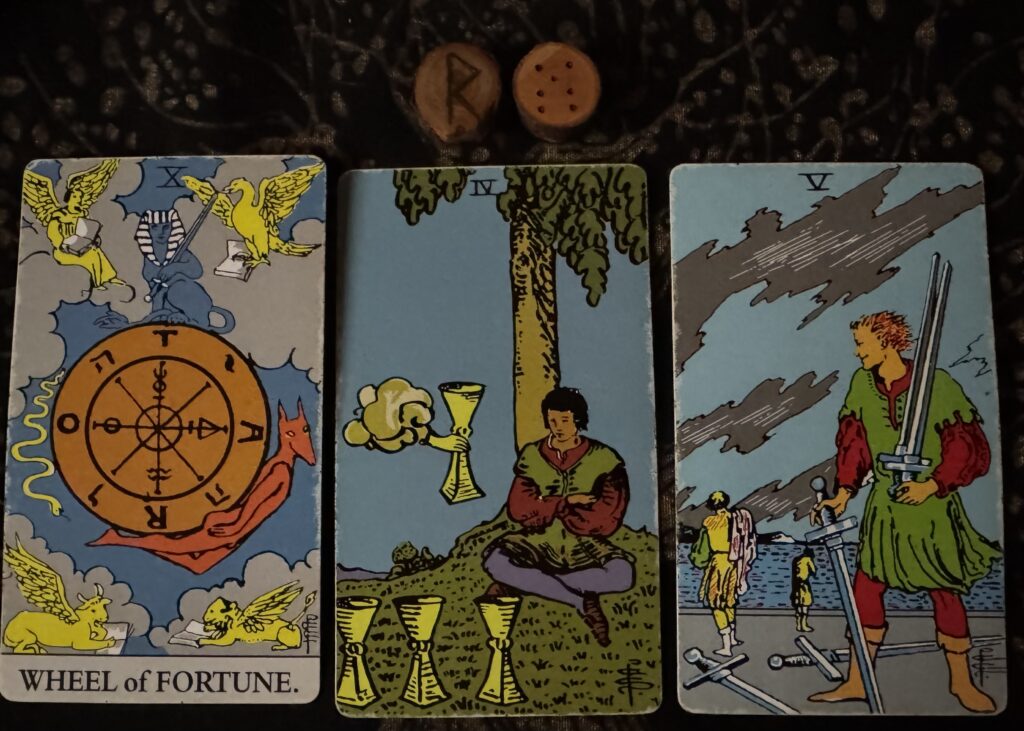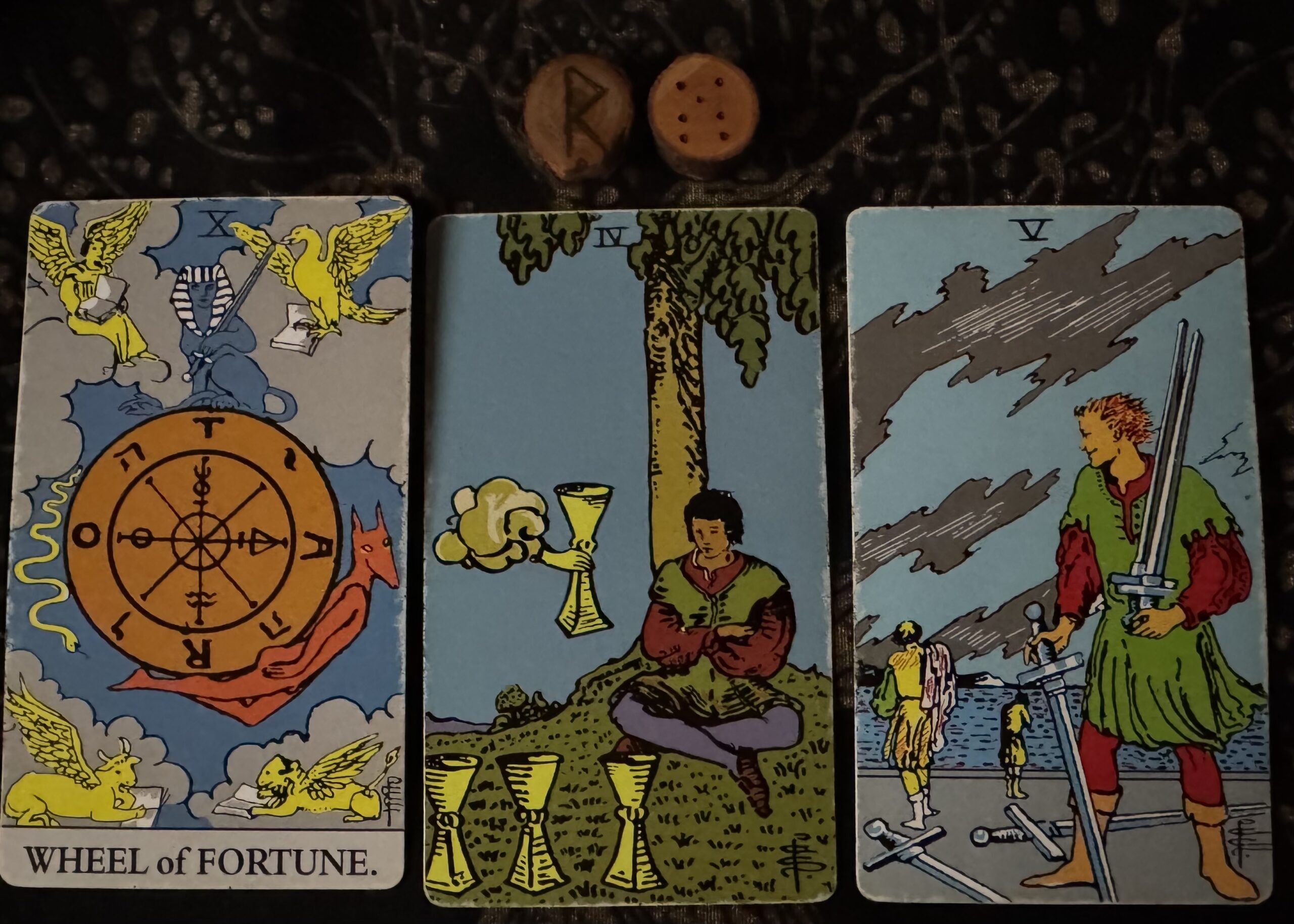 - Cards: Wheel of Fortune, 4 of Cups, 5 of Swords