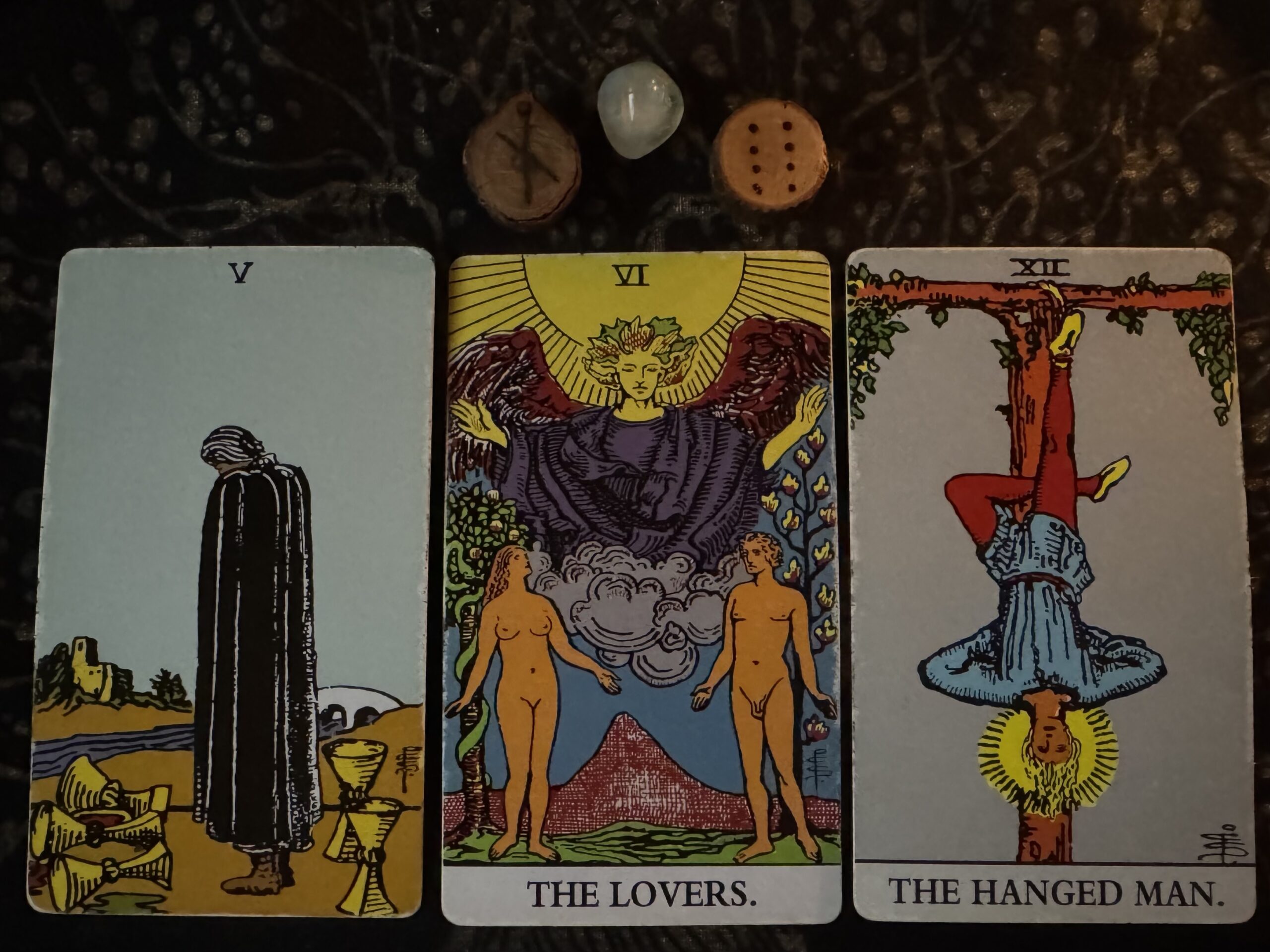 - Cards: 5 of Cups, The Lovers, The Hanged Man