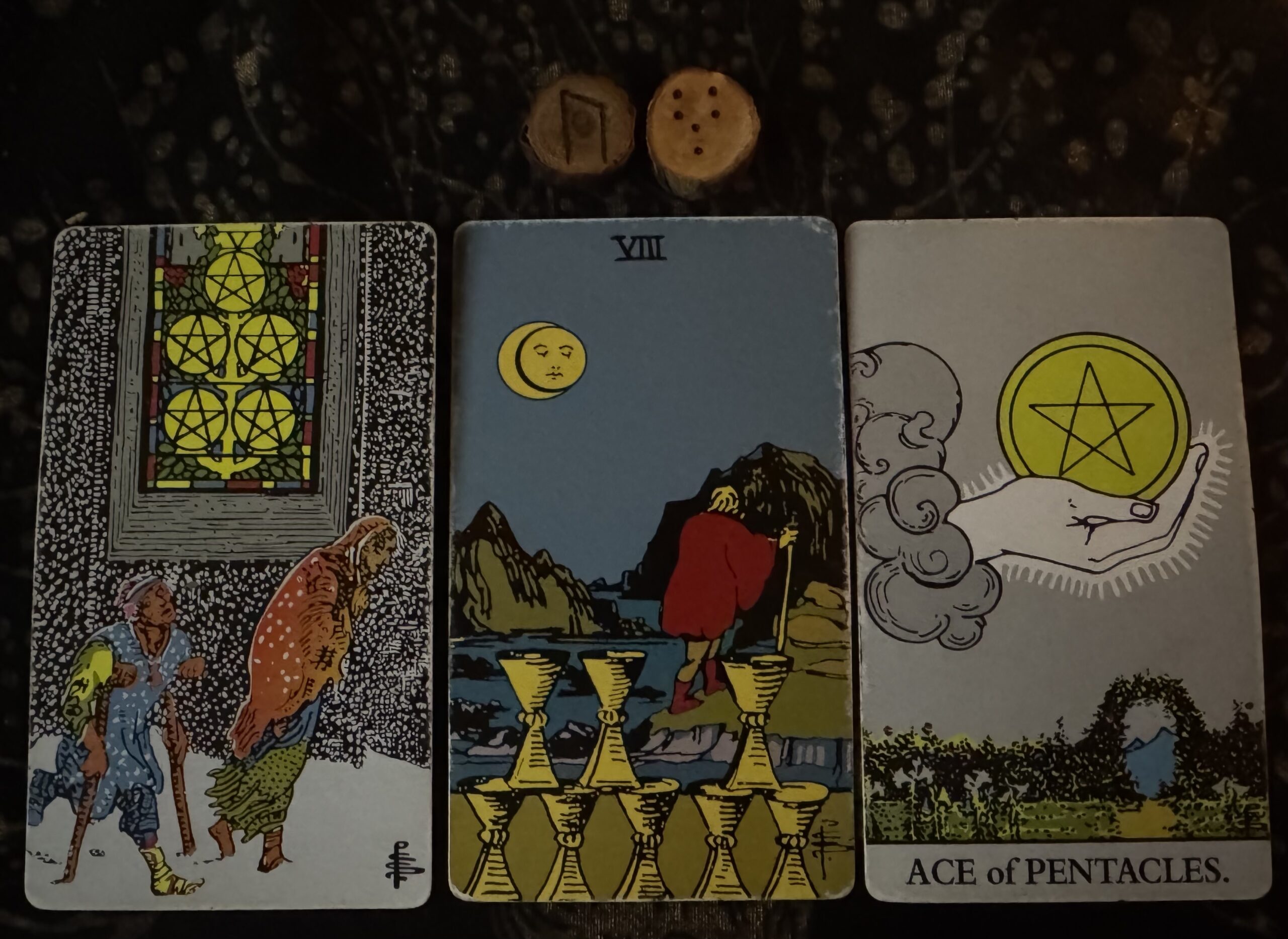 Essentially, today’s reading involves a change in your life that may seem insurmountable (5 of Pentacles). However, you possess the emotional strength to move forward (8 of Cups), irrespective of any challenges you may encounter along the way. From there, a new path may open (Ace of Pentacles) that allows you to manifest something that will be successful and possibly lucrative (Uruz, Fortuna Major).