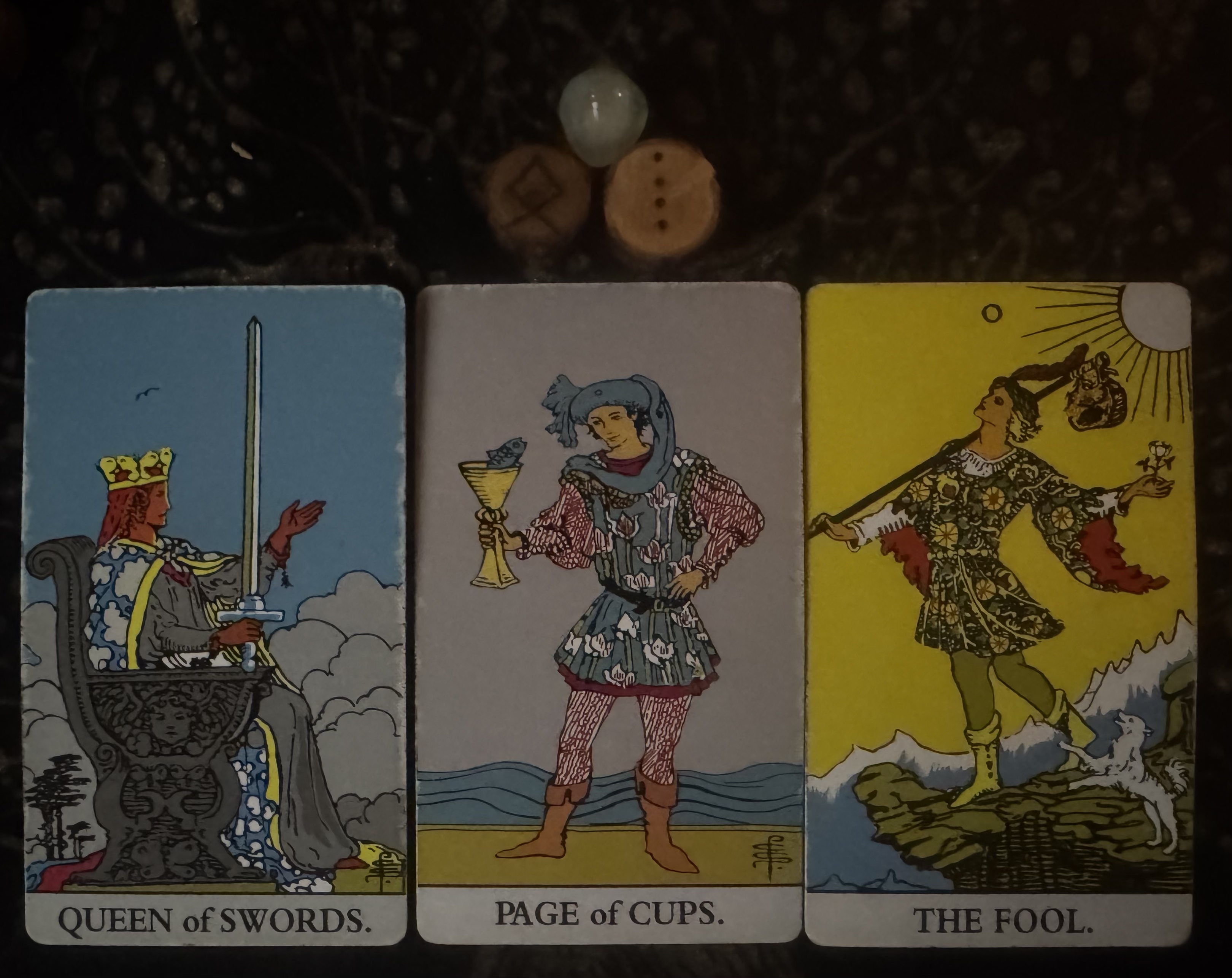 - Cards: Queen of Swords, Page of Cups, The Fool