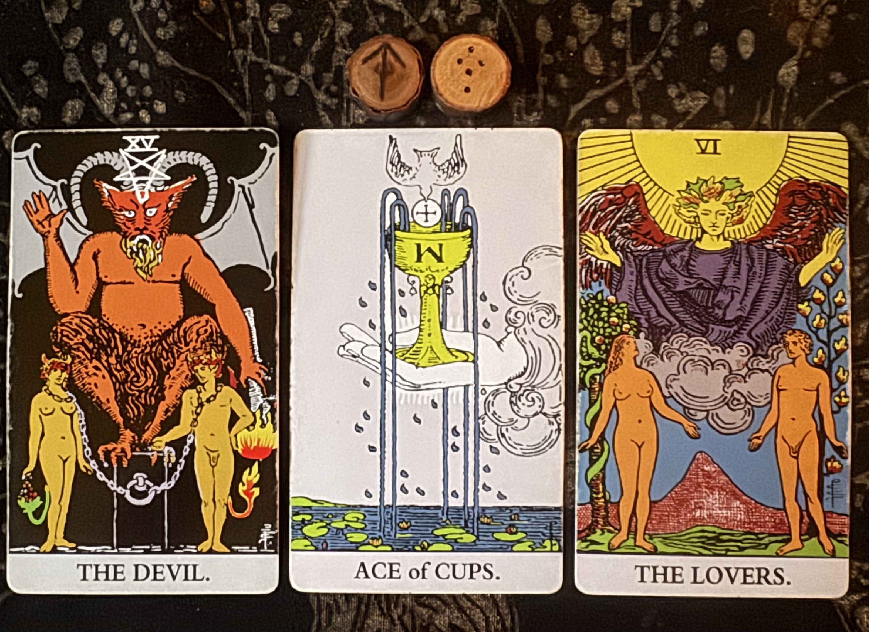 Today’s reading involves balance. Although I forgot to do the overall numerology during the reading, it was three, which also involves mind/body/Spirit balance. There is a balance suggested by the Major Arcana cards between a focus on ego (The Devil) and on Higher Consciousness (The Lovers). And, there are interesting commonalities visually between the two cards. The Ace of Cups in the center suggests the balance is emotional in nature.