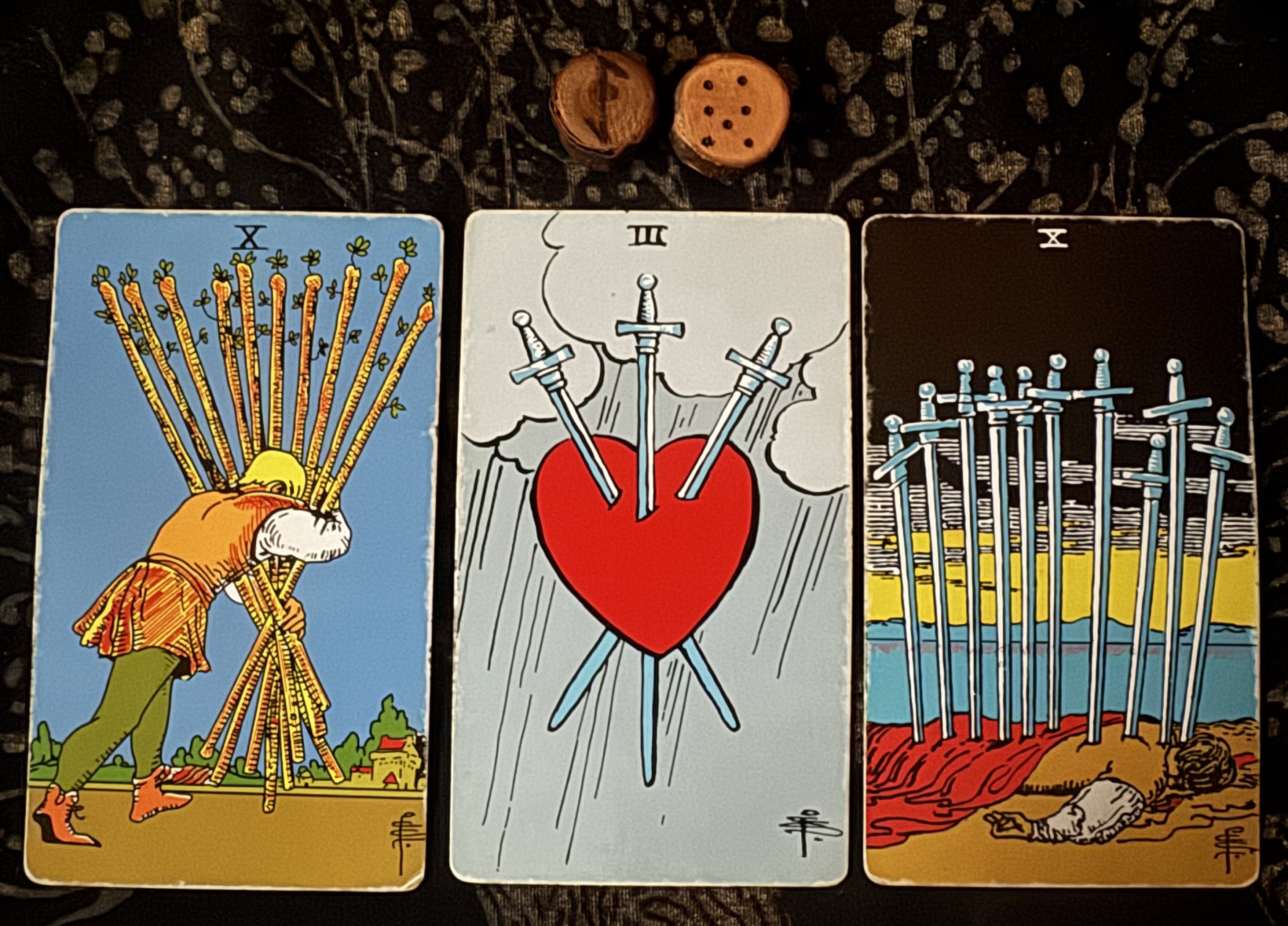 - Cards: 10 of Wands, 3 of Swords, 10 of Swords