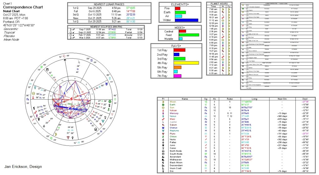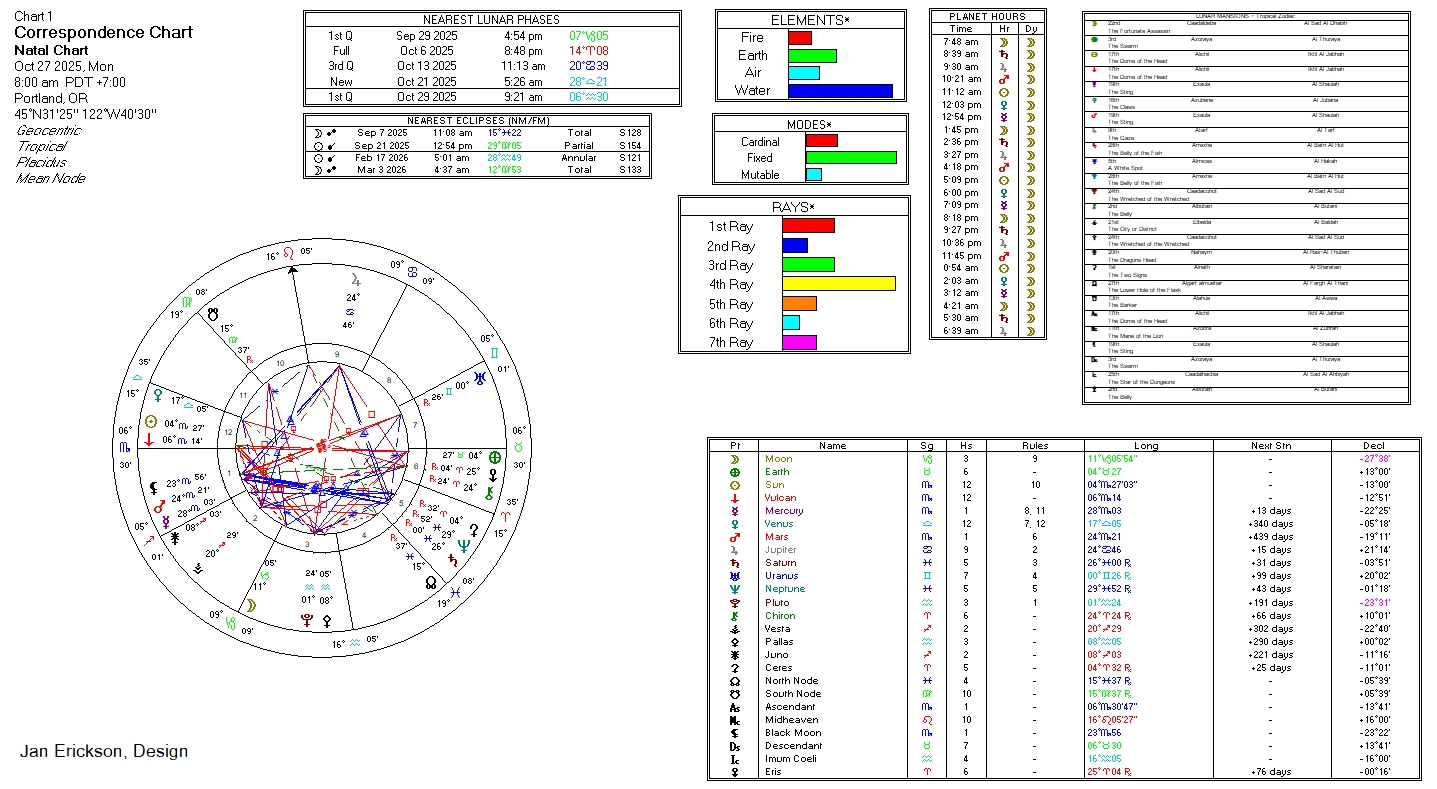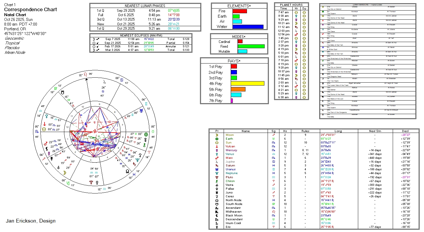 Below are the corresponding astrological and other energies for working magick, as well as the current transit charts for the week, followed by a a few spellcasting tips and recommendations. ~ et incipit magia