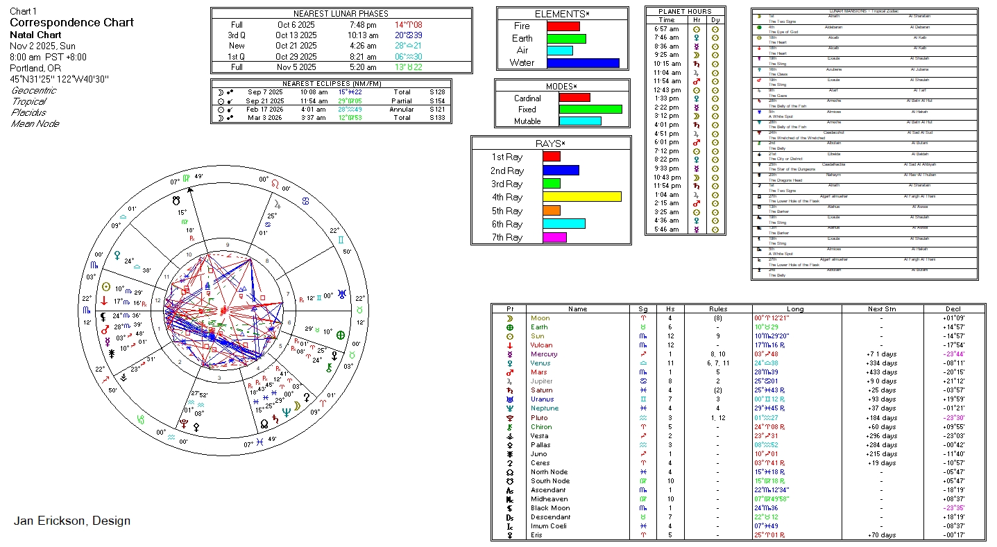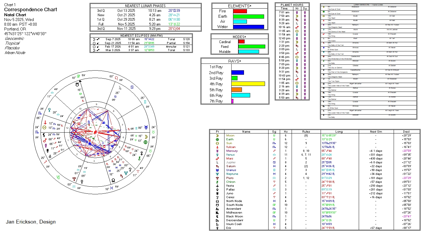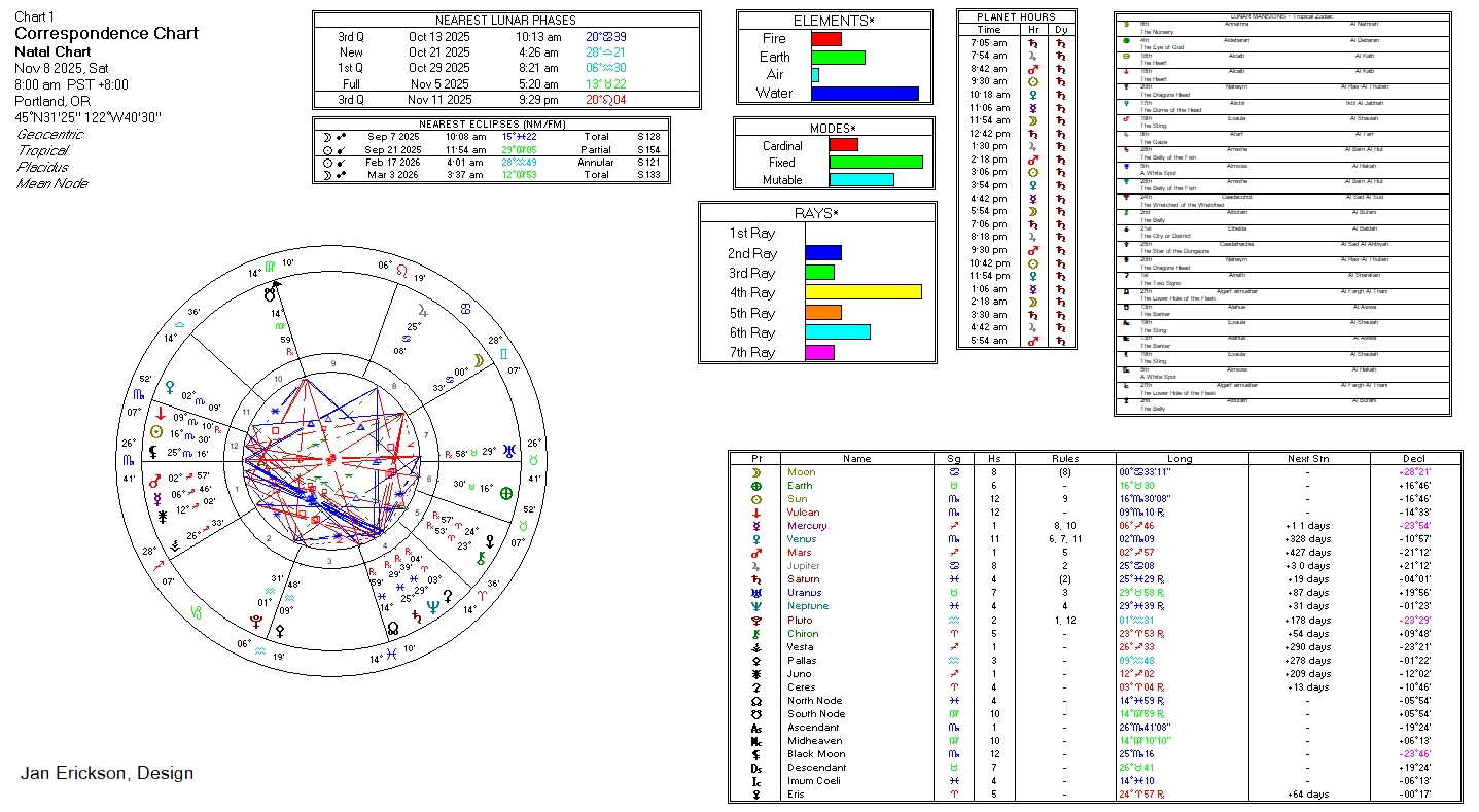 - Governing planet in sign: Venus in Scorpio (detriment) 11/6