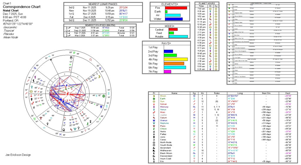 - 12/7/2025 – Sunday – Cancer (dignity) until Leo at 6:48p; Void of Course – 4:43p-6:48p; Waning, Full