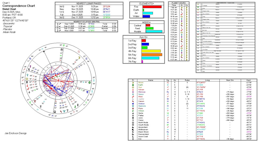 - 12/8/2025 – Monday – Leo; Void of Course – Not today; Waning, Disseminating