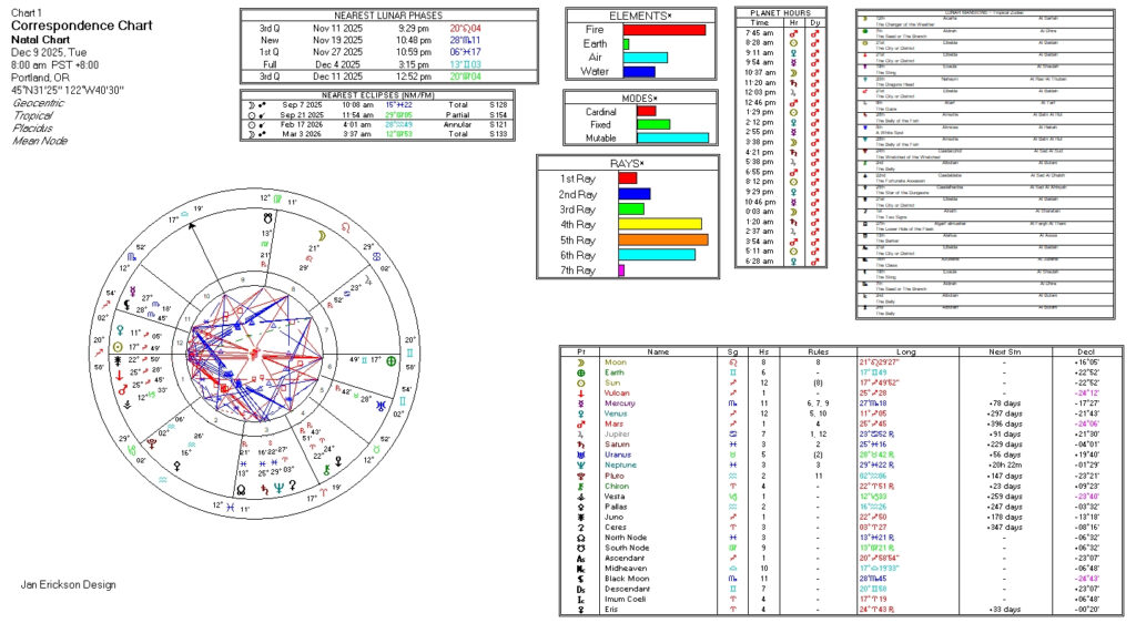 - 12/9/2025 – Tuesday – Leo until Virgo at 11:20p; Void of Course – 8:55p-11:20p; Waning, Disseminating
