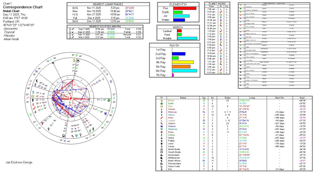 - 12/11/2025 – Thursday – Virgo; Void of Course – Not today; Waning, Disseminating; 3rd Qtr 12:51p, 20°Vi04