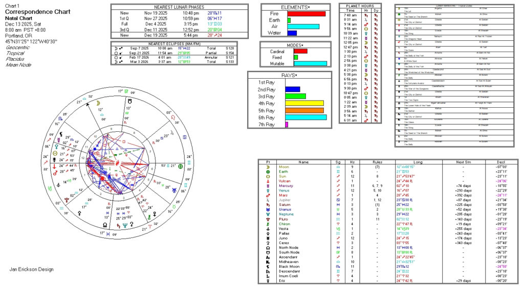 - 12/13/2025 – Saturday – Libra; Void of Course – Not today; Waning, 3rd Qtr