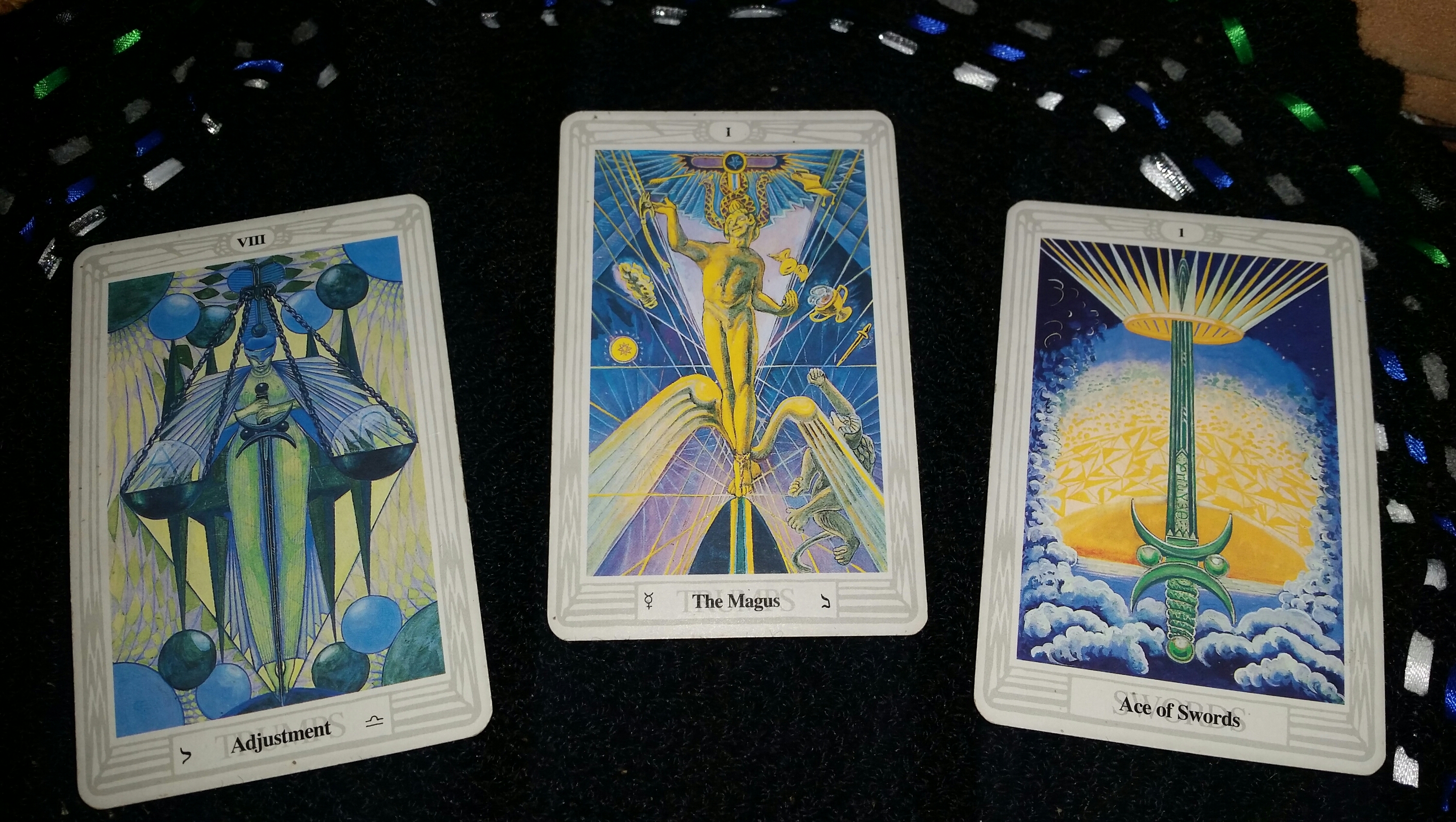 The redundancy of the Sword of the Magus is not to be ignored in this reading. Clearly, allowing for all possibilities, all potentials, is the preferred way forward. Judgment clouds our perception and the Ace of Swords cuts away all of that leaving only brilliance and clarity in its place. The dispassionate view suggested by Adjustment reinforces this notion as it supports decisions made from a balanced perspective. Crowley suggests a sexual component to the Sword, representing the phallus, referring to her as the woman satisfied. Please. The sword represents true balance. If she were truly reflecting satisfaction, I think other colors would have been used. The blues reflect the cold steel of the sword, balance, and alignment.