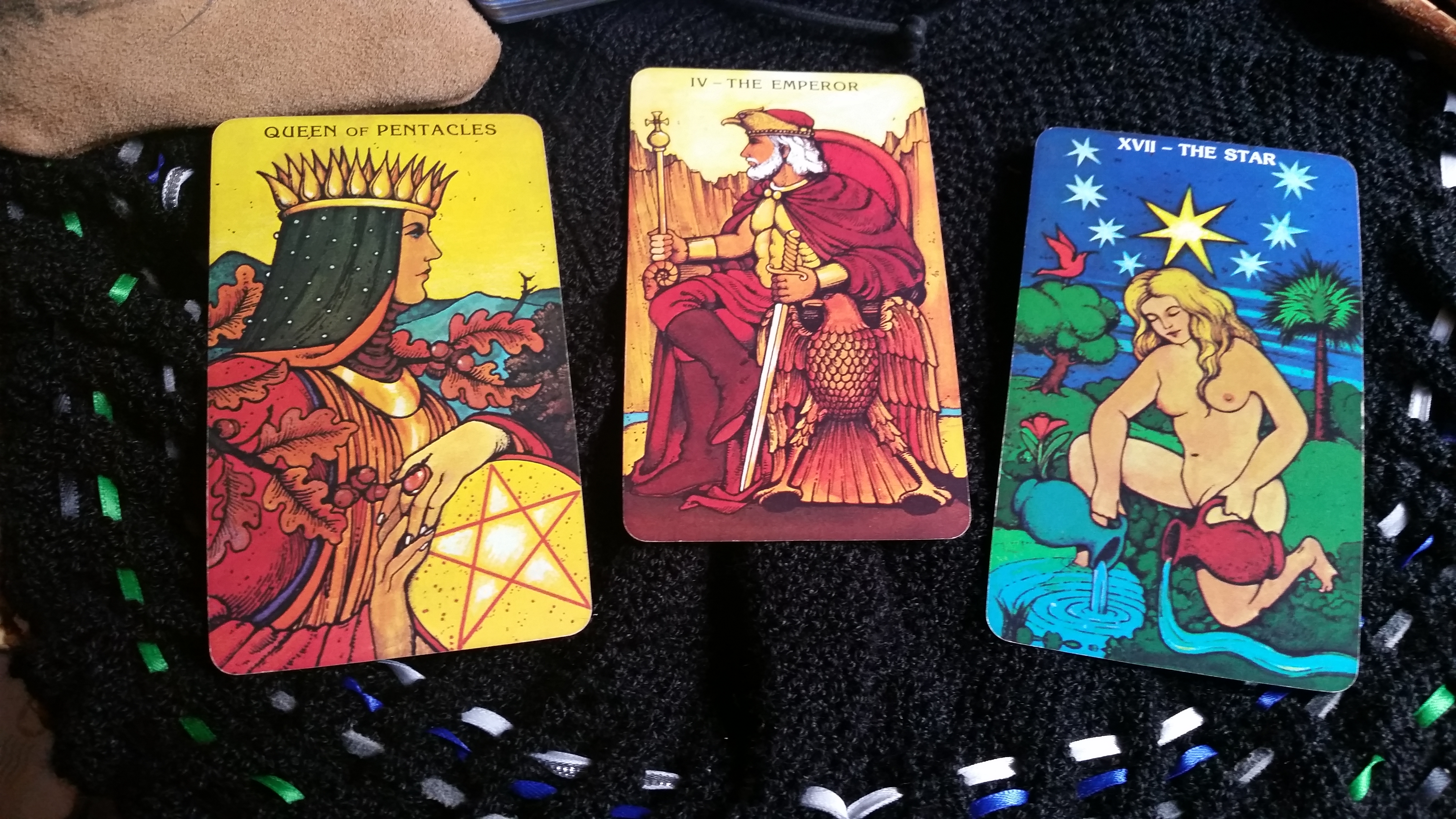 I love when I have cards that face each other. An interaction or engagement of some kind is happening between the Queen of Pentacles and The Emperor. Perhaps the cards reflect a husband and wife or some other partnership. The Star, the Blessed Conduit, brings optimism and openness to the couple’s interaction.