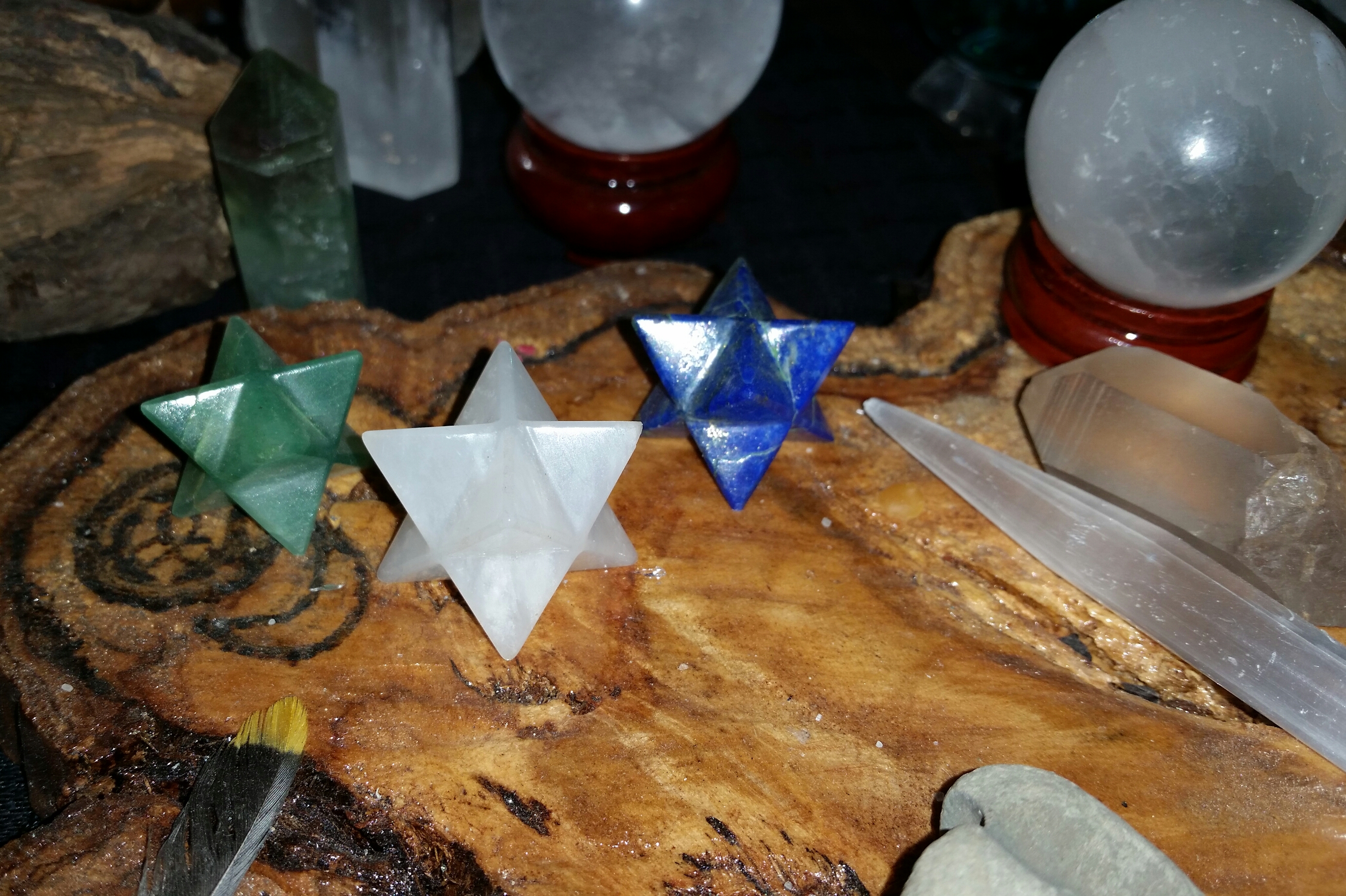 I surround myself with crystal Merkabas. I place them frequently around my altar. I have a meditation I do that is Merkaba-based. I envision Source Energy moving downward into physical form spinning in one direction, with Gaia Energy moving upward, spinning in the opposite direction. As I feel the separate triangles merge into the Merkaba shape, I exist in the middle, feeling its resonance, blending nonphysical with physical aspects of Self. When I feel ready, I return to the present moment. I use this meditation to align and center before practicing Reiki, before ritual, or anytime I need to align.