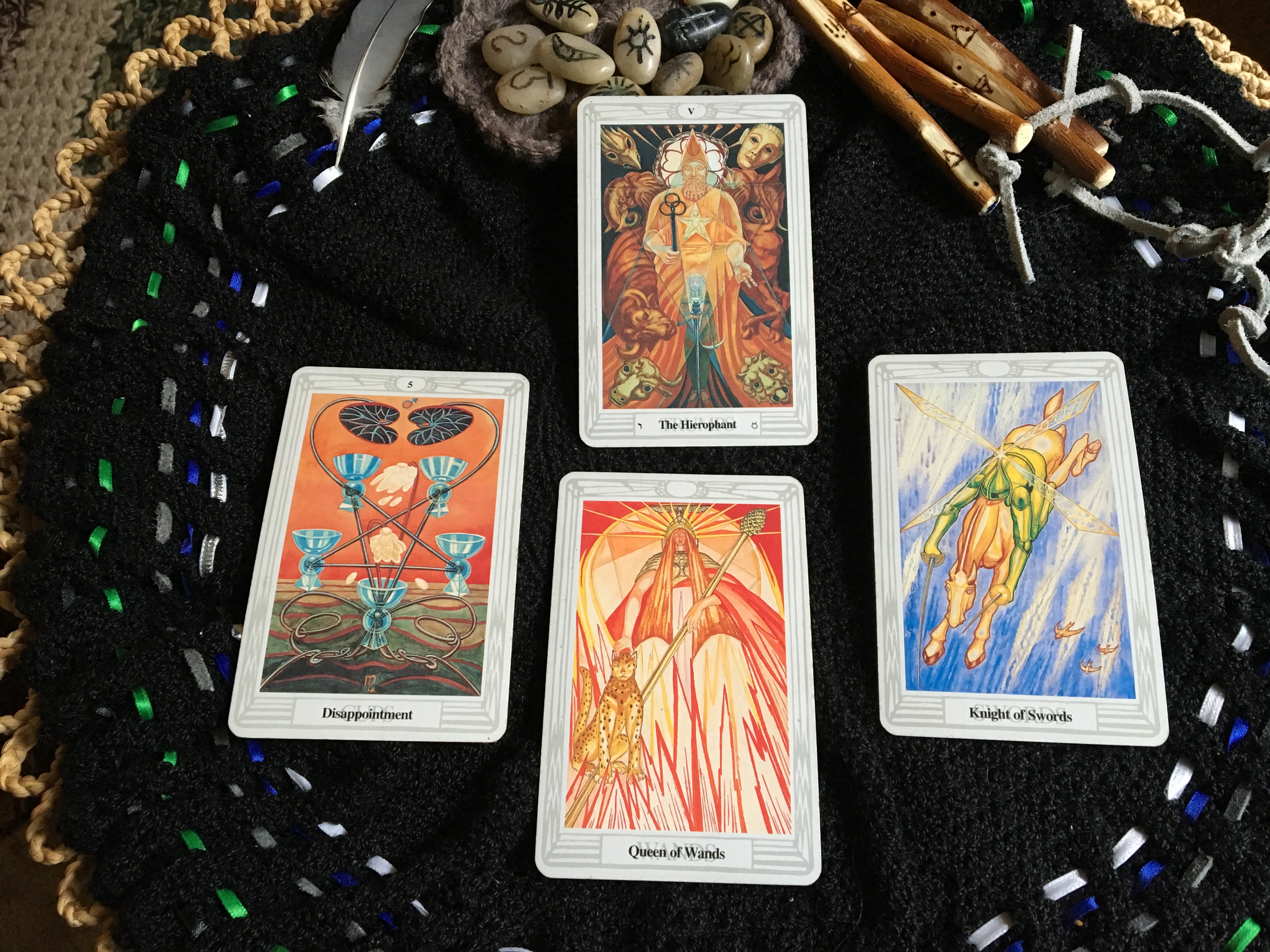 The Hierophant sits in the position of significator in this Thoth Tarot reading today. He is the Holy Guardian Angel within, our alignment with Source. The High Priest in other decks, the Hierophant represents mastery of knowledge, structure, and tradition. He is the enlightened teacher within and without, representing divine, spiritual wisdom.