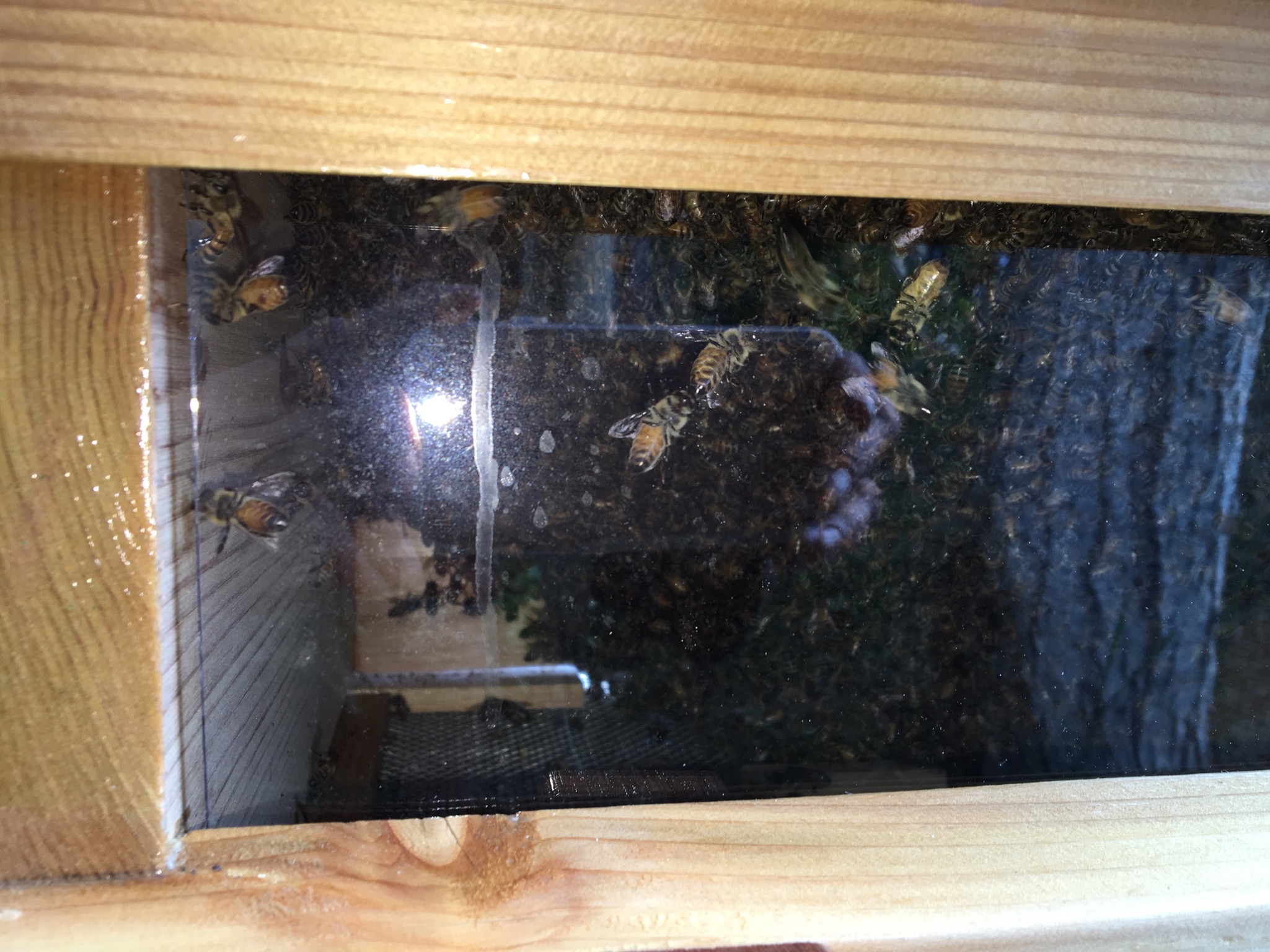 The Warre’ is a little different, however. Smaller in size, it’s customary to buy a package and dump them inside the box. The queen is in a cage, rather than on one of the frames as with the nuc. The nuc is essentially an established colony, with brood, honey, pollen, and drawn comb on plastic frames. The package of bees must first accept the queen and then begin building their comb for the queen to lay her eggs. She’s already taken her maiden flight for mating purposes at this point and she needs a place to begin laying. For this hive, I chose foundationless frames so that I could see them do their own thing instead of attaching to plastic foundation. This particular Warre’ hive has an inspection window to check out how the comb building is doing. The picture above was at the end of their first day in their new home.