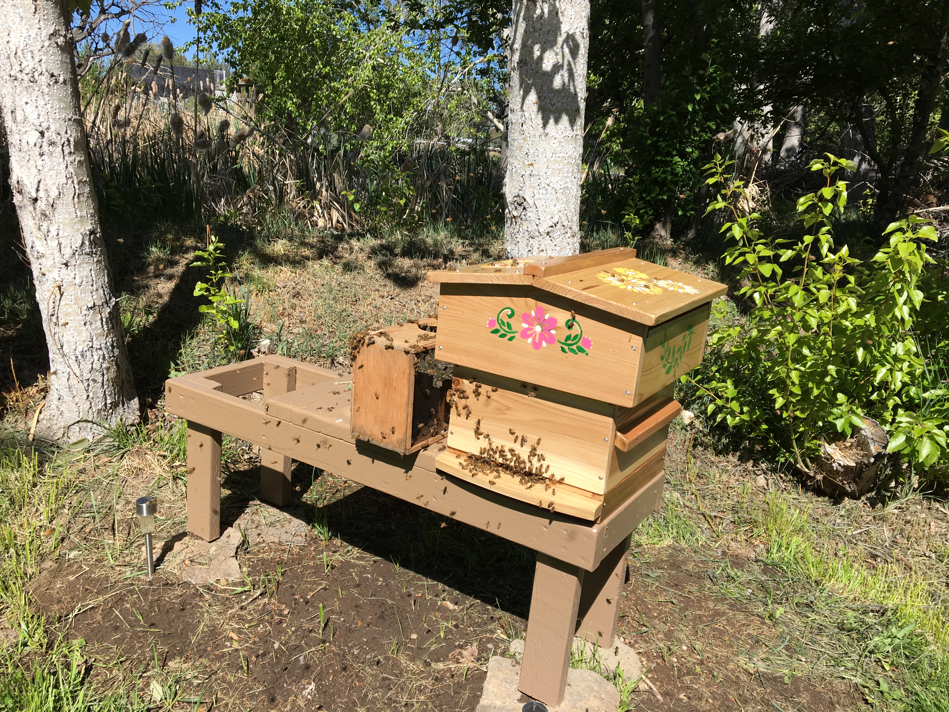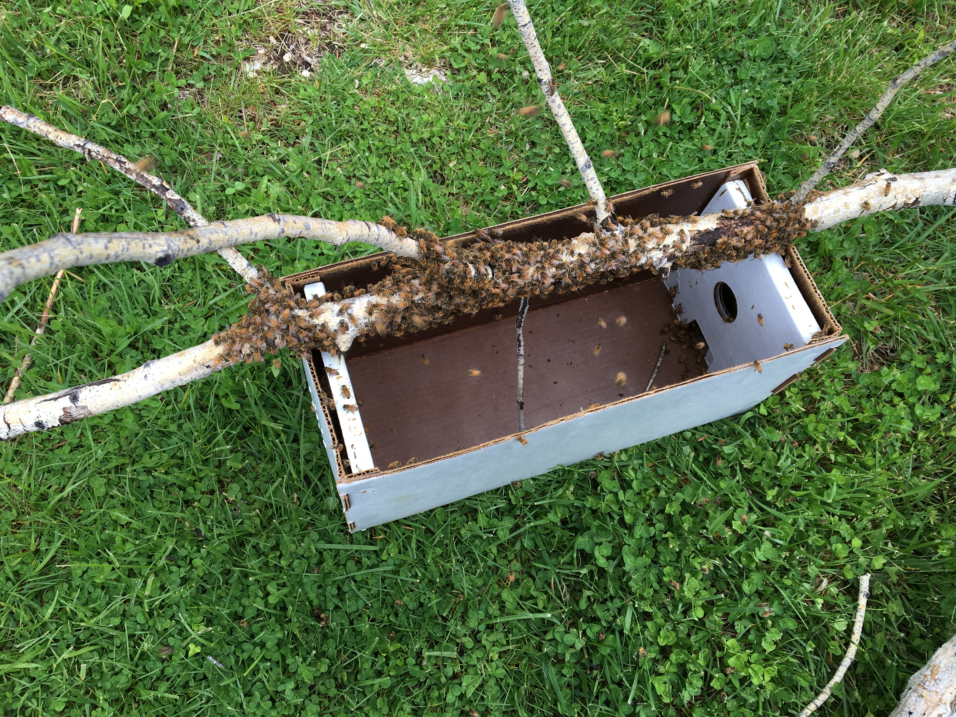 We discovered right away that if we didn’t put the plug back in the box, the bees would fly out and re-swarm in the same tree. At one point, they began bearding all over one of the hives. I brushed some of them back into the box and closed the lid. No ladder involved this time.