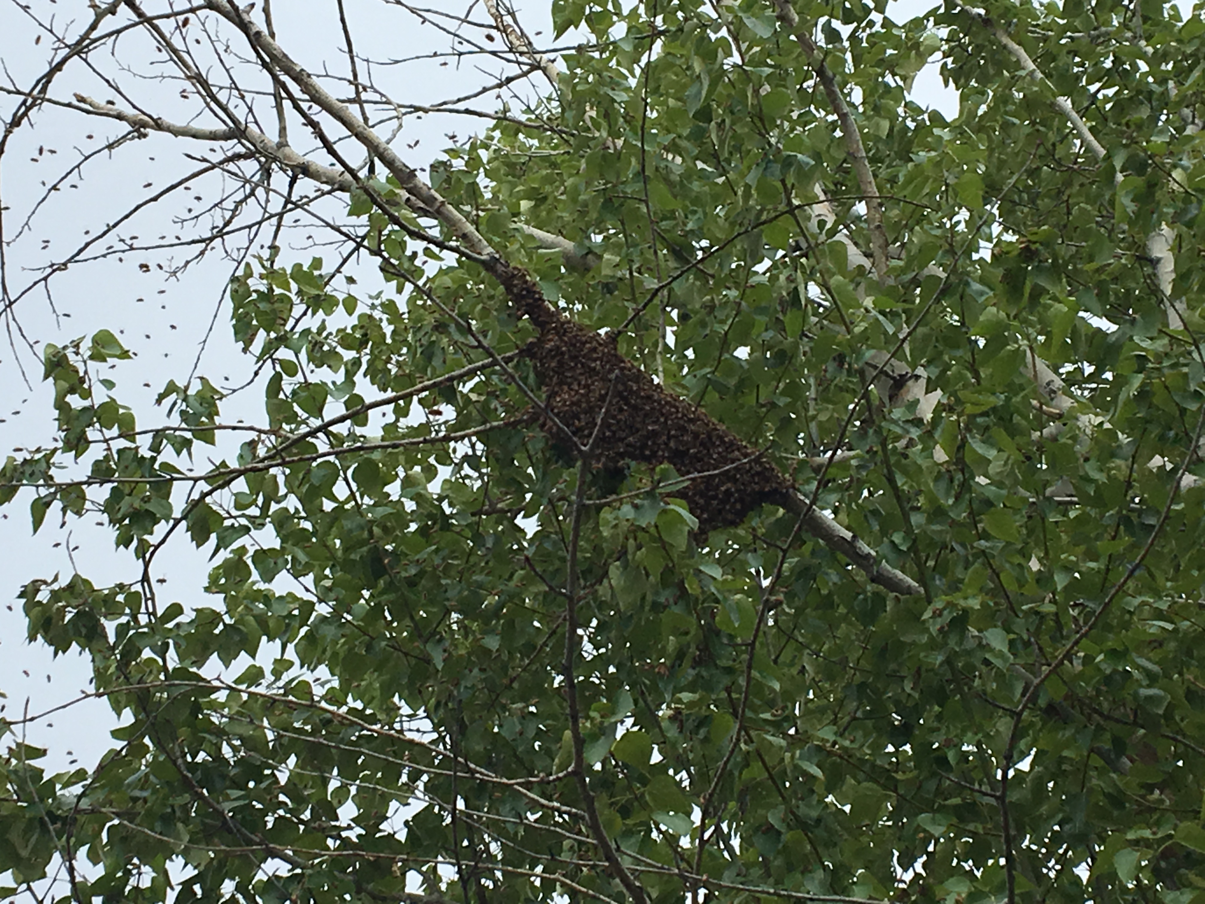 Well, not really cool as much as get the ladder. At least they only went up a few feet. It was our first swarm so we winged it. Jerry got the nuc boxes we have and I got all the pruners I could find. Sometimes you have to prune as you go and you might have to cut the branch they’re on. The bees swarm around the queen, and when they do that, they’re somewhat docile. And it really was cool watching them build their clump. Which they had to do a couple of times because we made several attempts before we got them in the box. Sometimes they drop right off of the branch and fall to the ground as a unit. At least they landed in the cattails. Jerry had to hold the limb there and let them swarm back up and reattach before climbing down with the swarm.