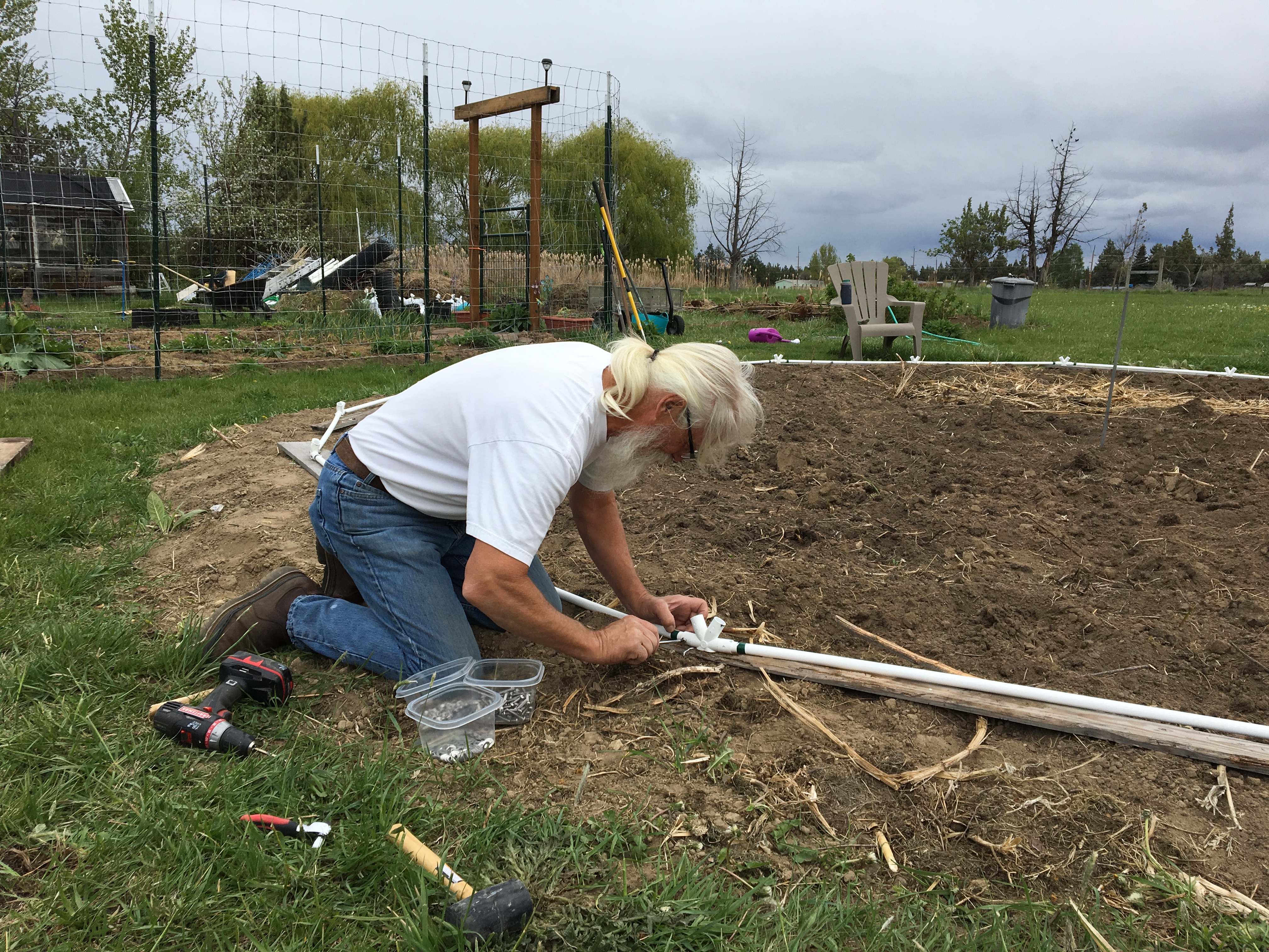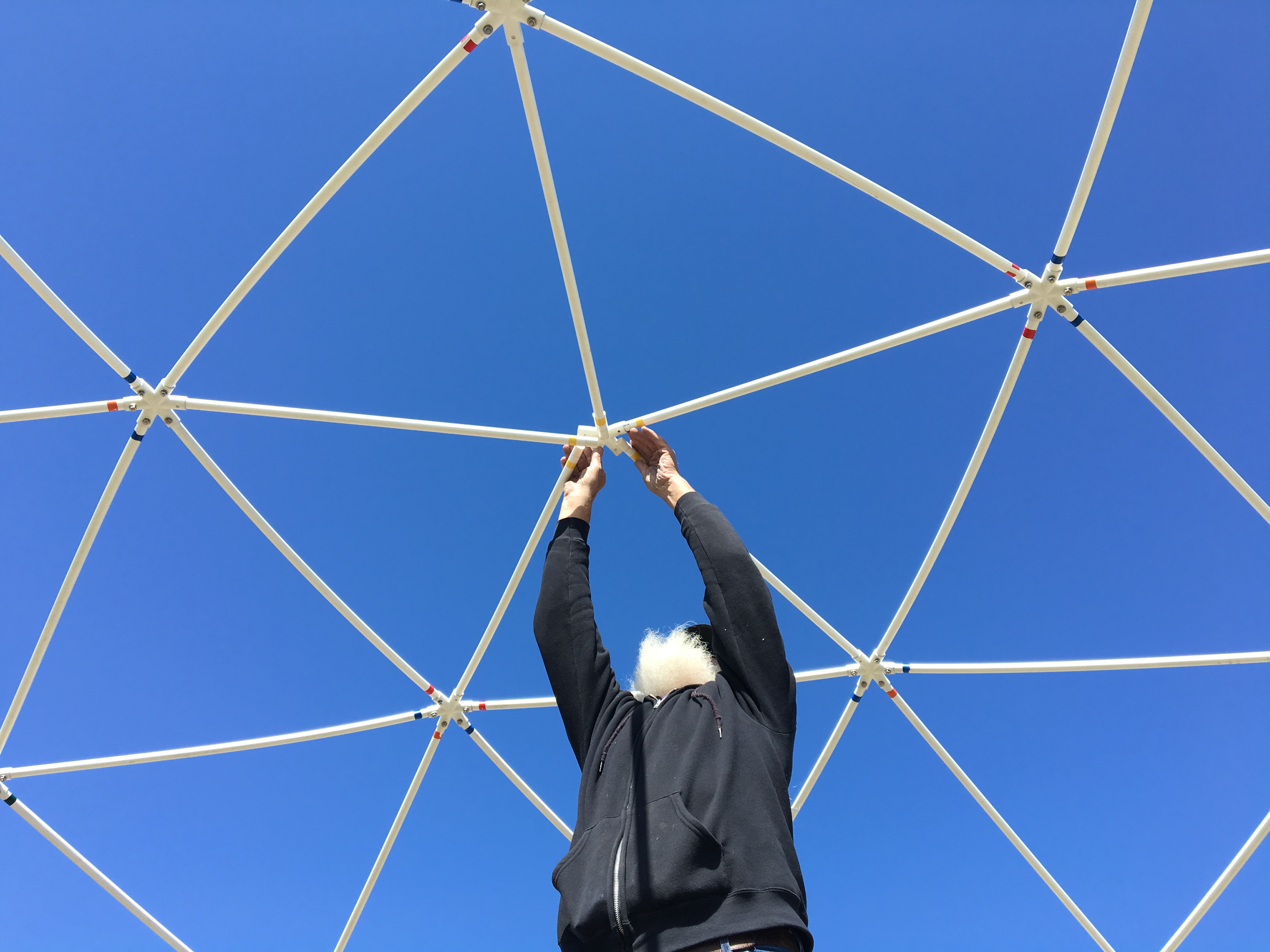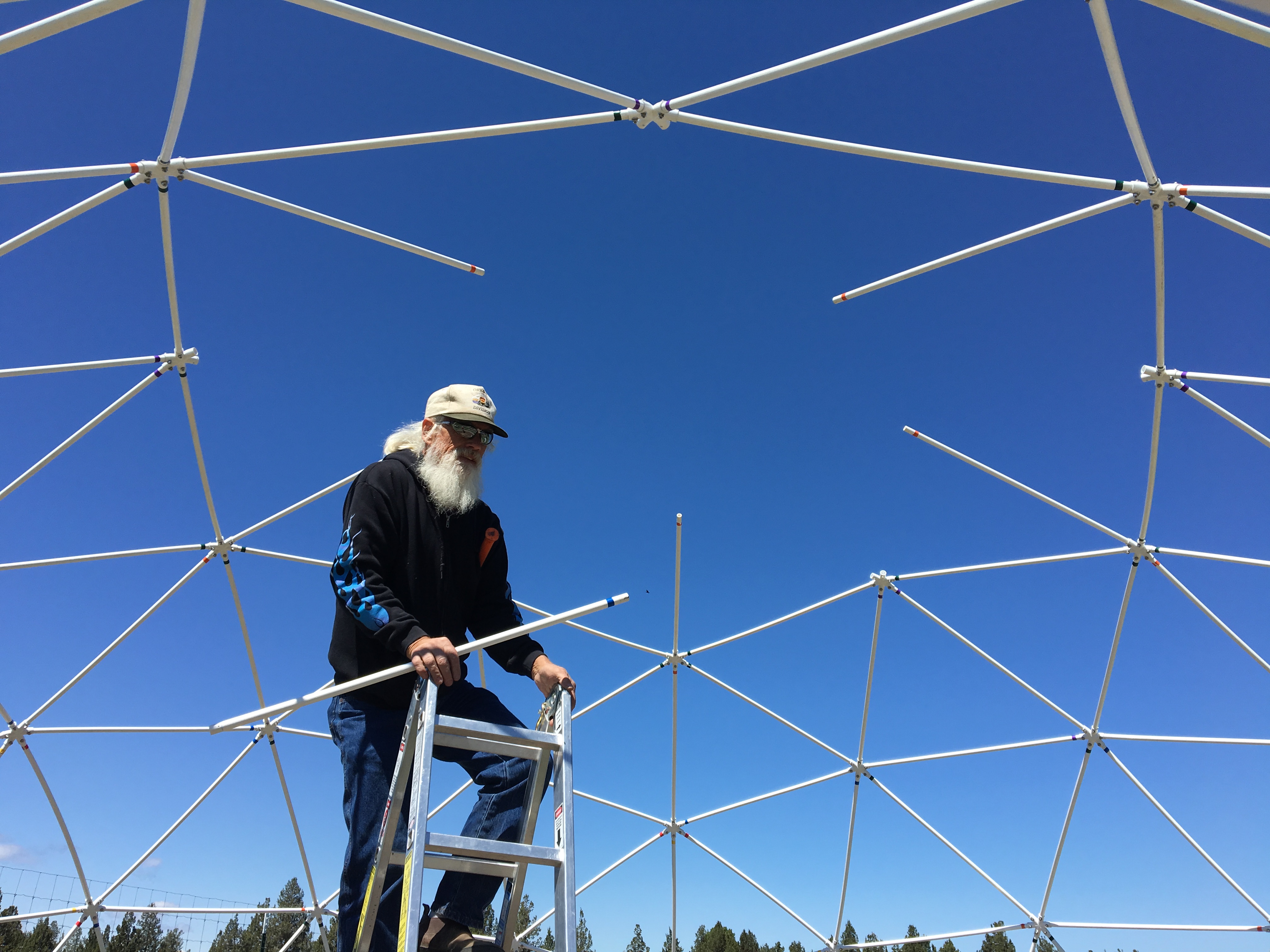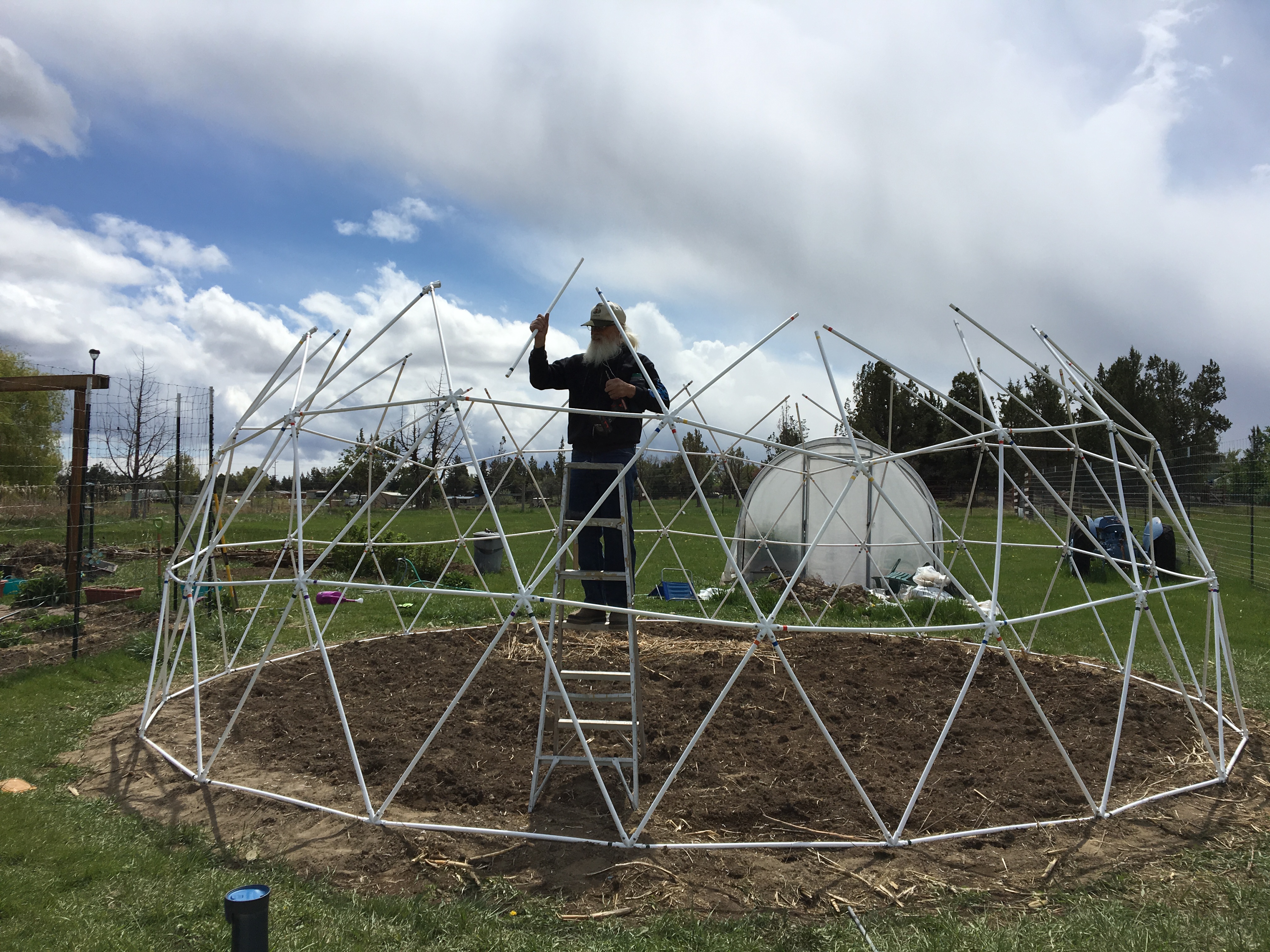 We used a dome kit from Sonostar Hubs. There are a variety of options from simple kits to kits that come with everything. We decided on a kit that was 12 feet tall and 24 feet in diameter. This particular kit went together flawlessly and I highly recommend this company. We bought a kit that included pre-cut PVC pipe but you can buy your own locally and use their dome calculator to see how much and what length you’ll need. Jerry painted each section with white paint and then he pre-drilled each hub. When it came time to assemble the dome, he used the holes in the hubs to drill each section of pipe, while I dutifully handed everything to him. I’ve doing that for the last 37 years so I’m an awesome assistant.