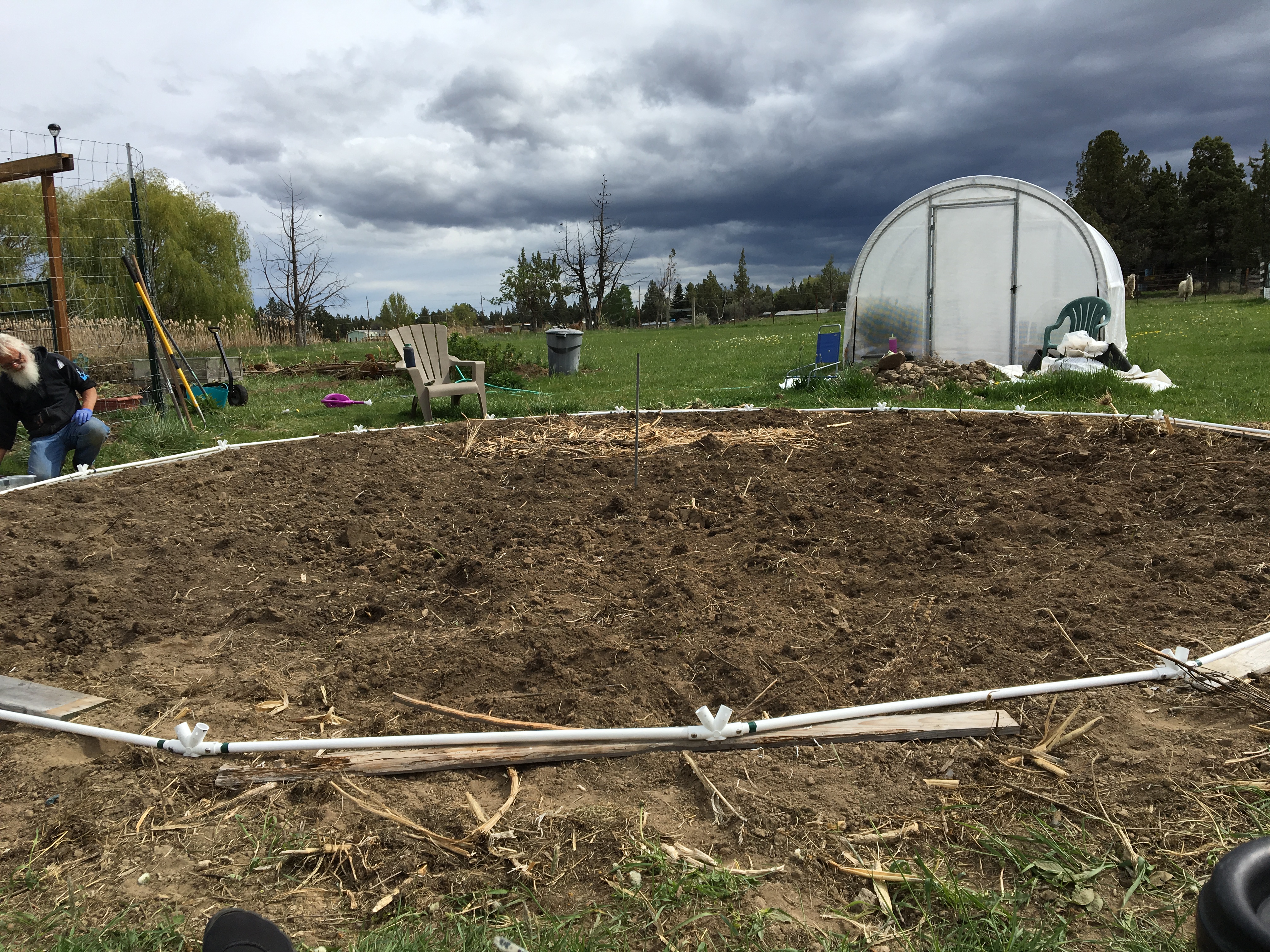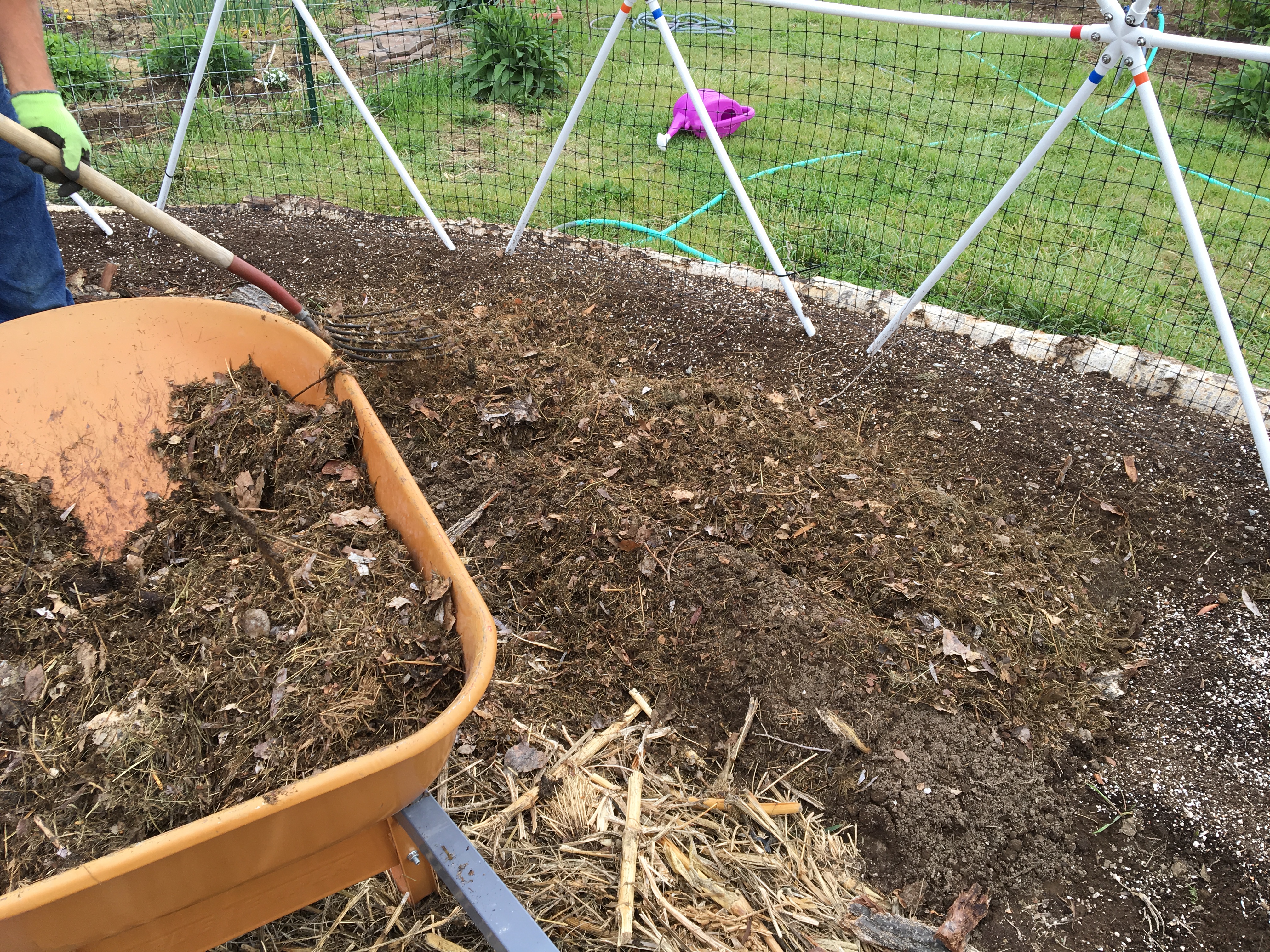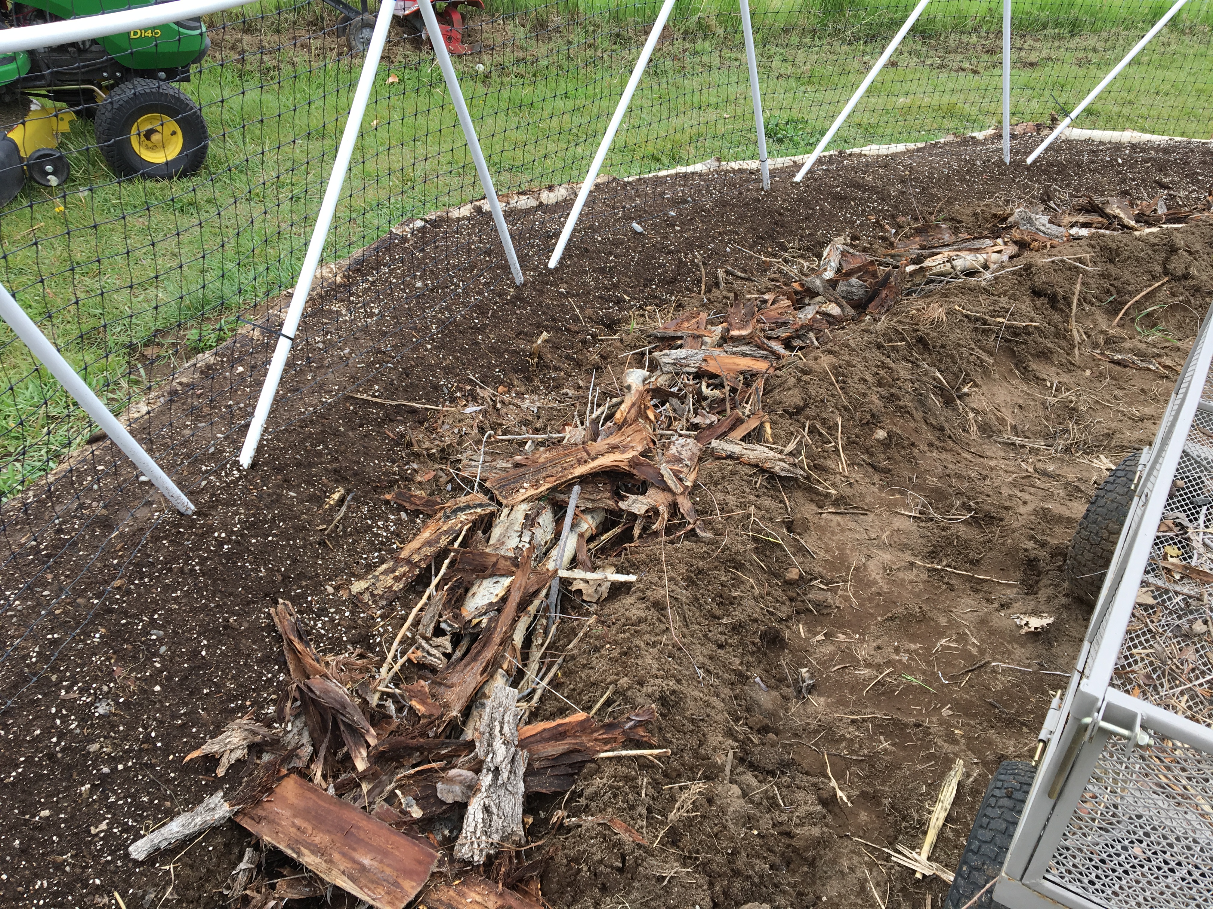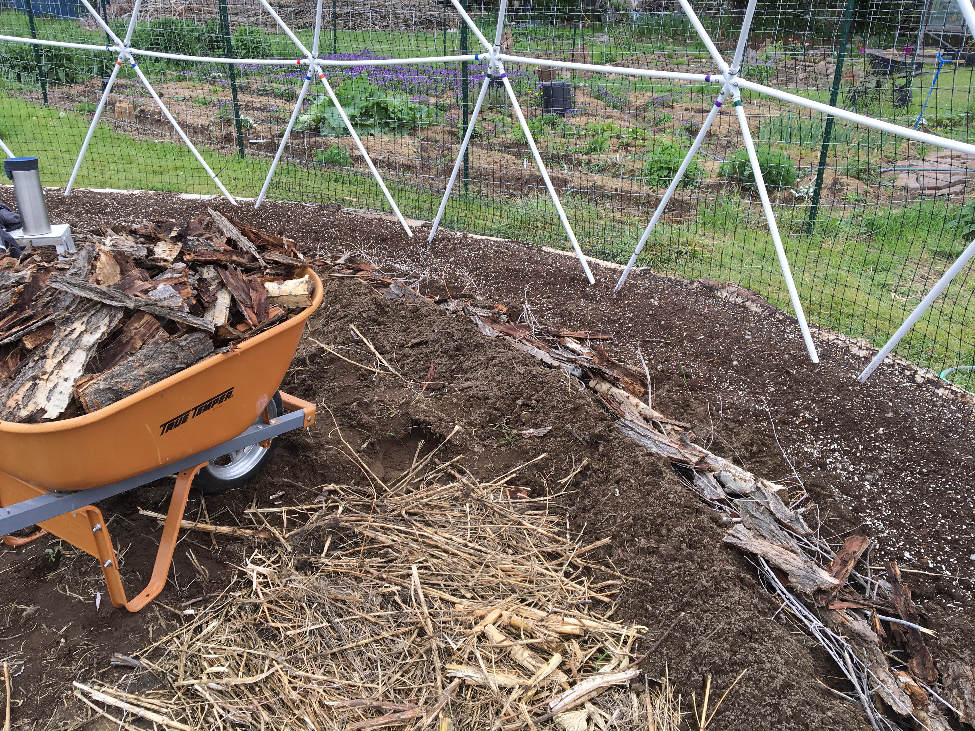 We raked back the soil around the inside perimeter of the dome, adding small logs, bark and other wood debris, watering it well. Next we added compost and soil that we prepared using top soil we had delivered from a company that usually has good top soil. Unfortunately this time around, it was full of rocks. So we won’t be buying any top soil from them anymore. It cost a fortune and the last time I actually got decent top soil.