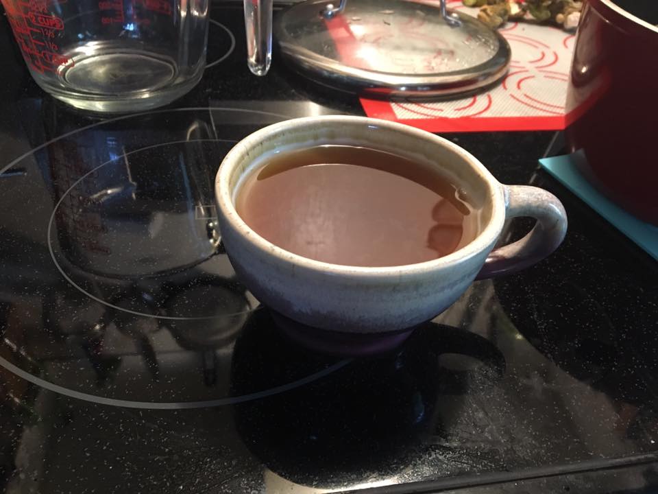 After straining the tea, I poured myself a cup. The rest I poured into a quart mason jar which I’ll keep in the refrigerator to use over the next couple of days. It’s a fairly strong tea, so it’s fine to dilute it a bit with water before reheating. I don’t really use specific amounts when I make teas. I usually just gather up some herbs, throw them in and don’t look back as my husband would say.