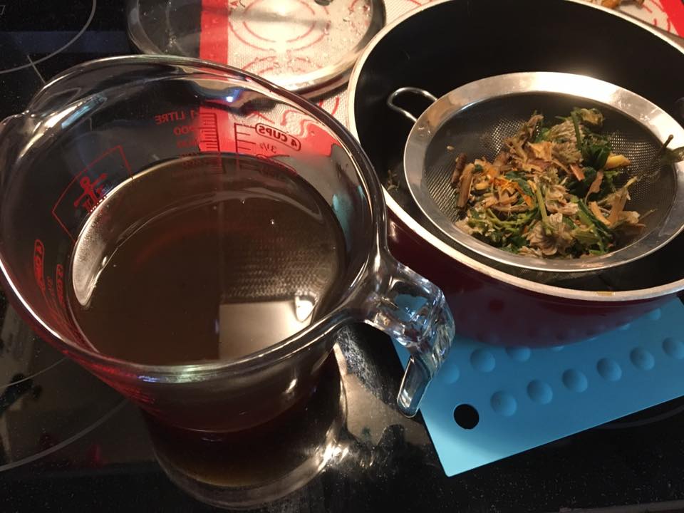 Because I’ve used herbs that require different processing, I decocted (simmered) the bark and roots first, and then added the more fragile herbs to the decoction after removing it from heat for the final infusion. Typically I decoct roots, bark, seeds and berries. Valerian is one root, however, that has high volatile oils so that one needs infusion because boiling it reduces its effectiveness. But in today’s tea, everything is fairly straightforward.