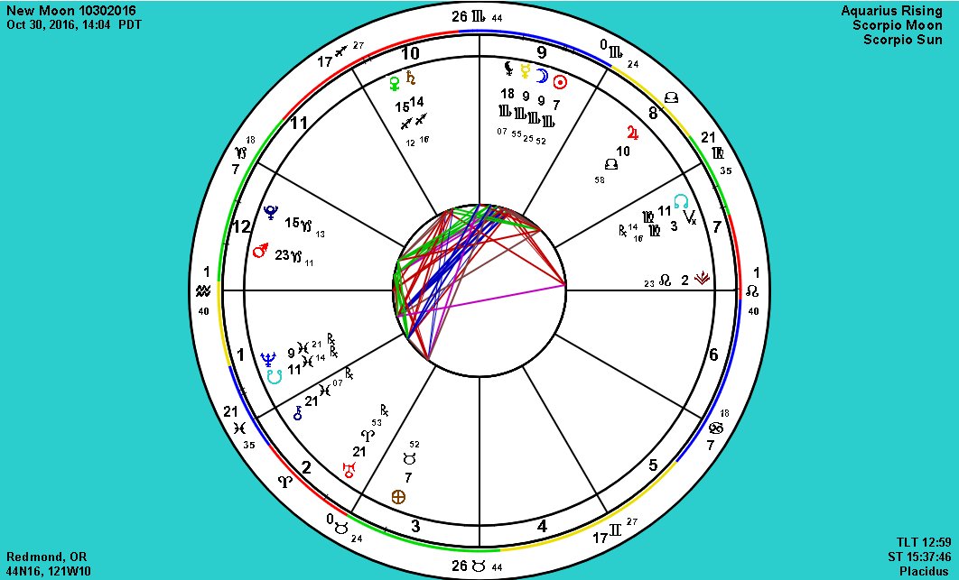 Tomorrow’s New Moon transits in Scorpio (9° Sco 25′ 29″) in the Ninth House. Emotions will be heightened and we take pleasure at the beauty that surrounds us. But as emotions run high during this time we should stay aligned in an effort to keep overreaction to a minimum. Just sit back, enjoy your process and feel the love of home and family. Find your sacred space.
