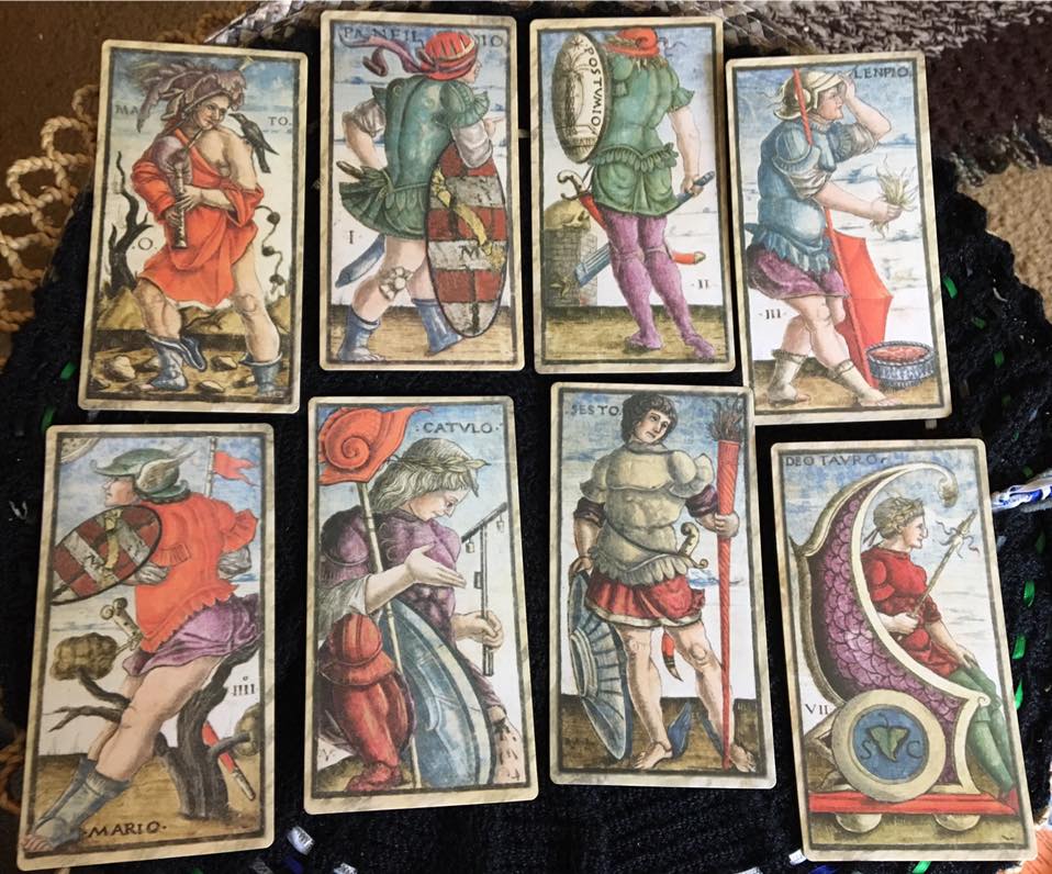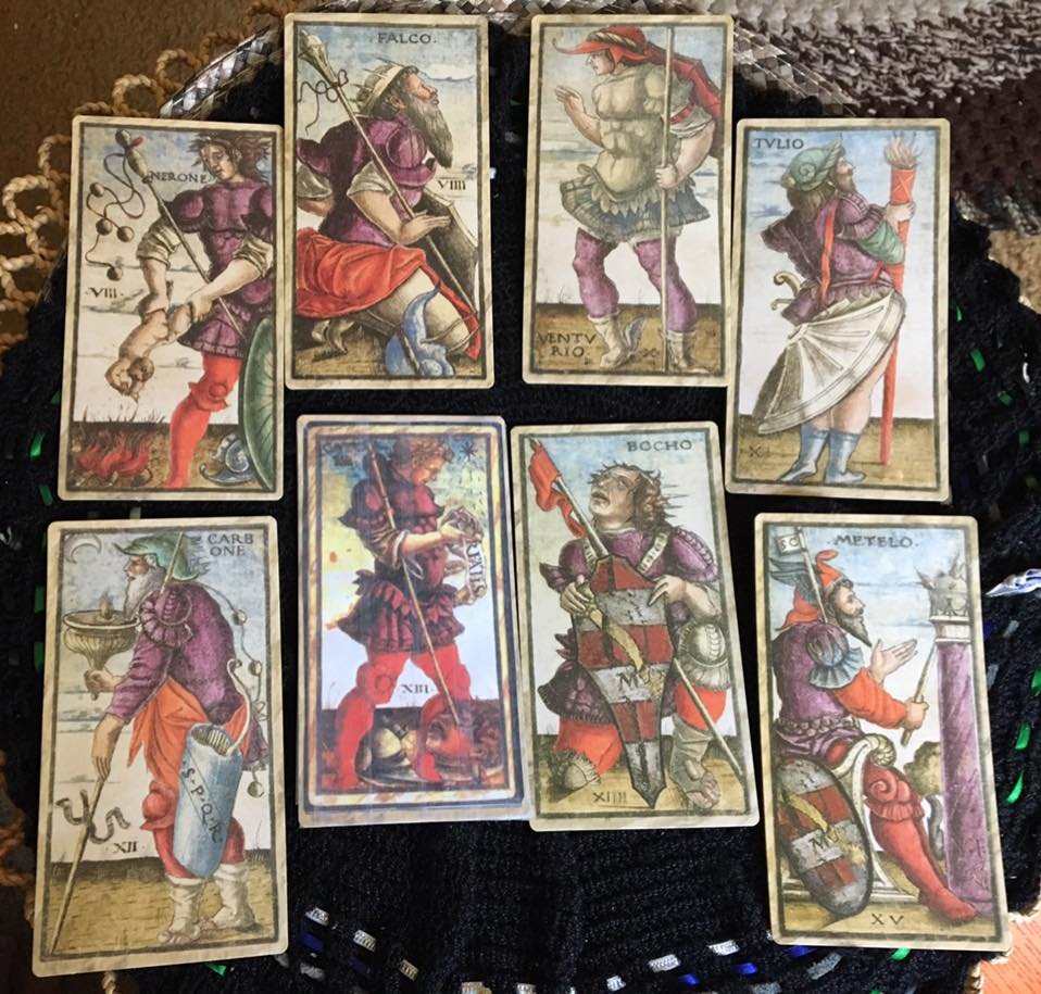 I love old Tarot decks. Sola Busca is reportedly one of the oldest and the first to include the Minor Arcana cards using more than just symbols. I also have the Visconti-Sforza deck which at least has a small handbook available to have some idea what the creator was thinking about when designing the cards. Not so with the Sola Busca tarot deck. Although I’ve found some information online, the Major Arcana appears to be less about soul archetypes and more about rulers and military leaders in ancient Rome and Greece. Without a full history on each individual, determining how or if each card’s interpretation corresponds with traditional decks is challenging.