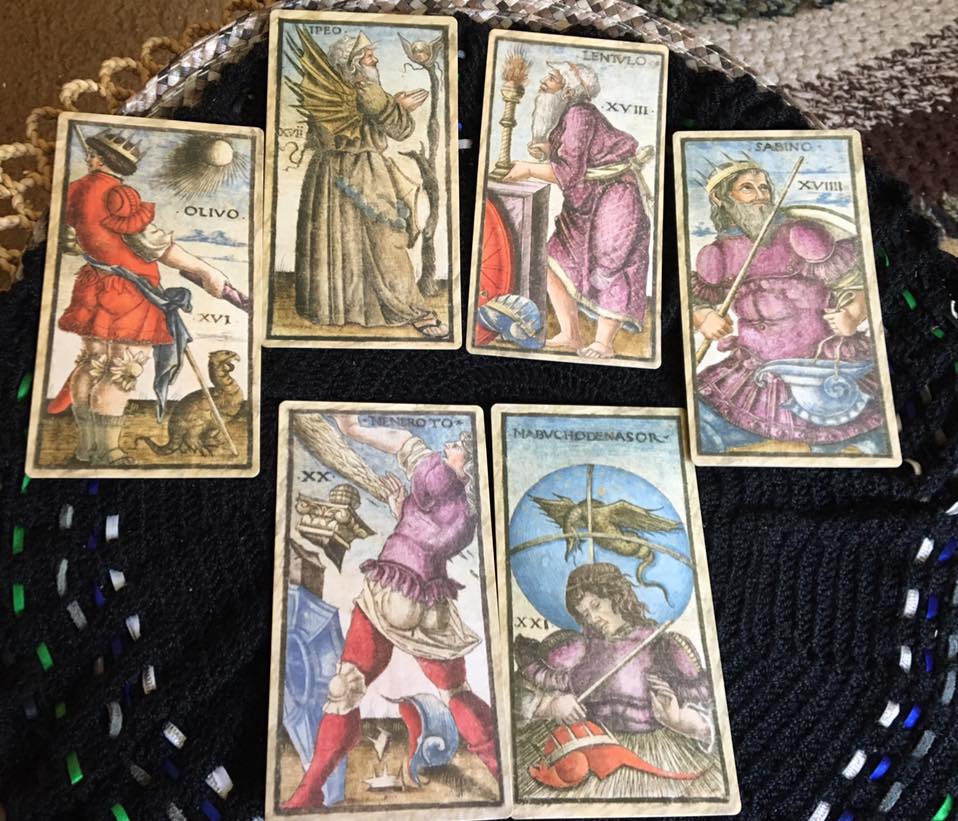 I chose a three-card spread and drew the 6 of Cups or Amphorae, the 5 of Cups, and Metelo, the 15th card of the Sola Busca Major Arcana. Although Metelo corresponds numerically with the Devil card in traditional decks, scholars believe instead it represents The Emperor so I’ll use that interpretation for this reading. No clue how I’ll handle the other Majors. The other thing I noticed is that each of the Majors includes only men in their depictions reflecting the patriarchy that was in full swing in those days. And Alexander the Great along with his family appear prominently in the Court cards.