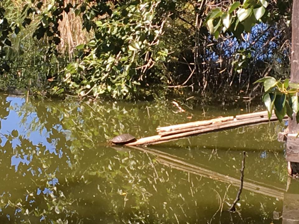 Whenever I happen upon a new animal or insect on our property I take notice. Sometimes they’re just passing through, but sometimes they stay and yesterday we noticed a turtle sunning itself on a plank the geese and ducks use to access the dock in our pond. We’ve lived here for thirty-six years, raising our two boys here, and although lizards are prevalent none of us can remember seeing a turtle. I found what I believed was a desert tortoise on my driveway a few years ago and took it to a pet store who gave it to someone who had lizards and other reptiles, but I’ve never seen one in the pond before.