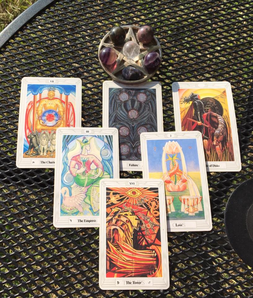 Just as the eclipse was beginning, I drew six cards from my Thoth Tarot deck. The top three are general influences, the center two are inner and outer influences and the bottom card represents the outcome. The numerology is interesting in that three 7’s occur with The Chariot, the 7 of Disks, and The Tower itself reducing to 7. Together they reduce to 3 aligning with The Empress. Overall, the numerology is 8 or structure and practical matters while Earth dominates over Water in the Major Arcana cards.