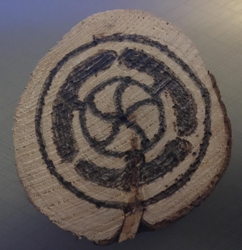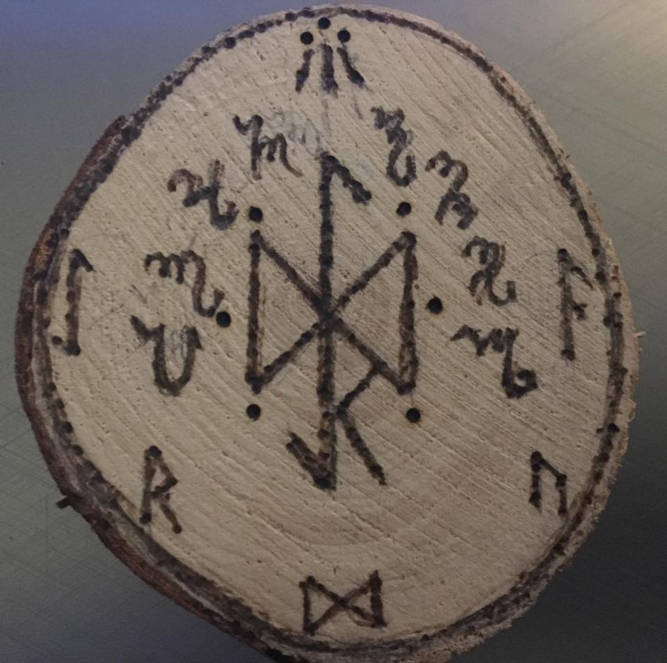 I decided to burn Hecate’s wheel for the sigil on one side of a round piece of juniper and the bindrune on the other. I also included a command in Theban script to grant me access to the realm of Spirit surrounding the bindrune as well as the runes comprising the bindrune. Here’s what I came up with.
