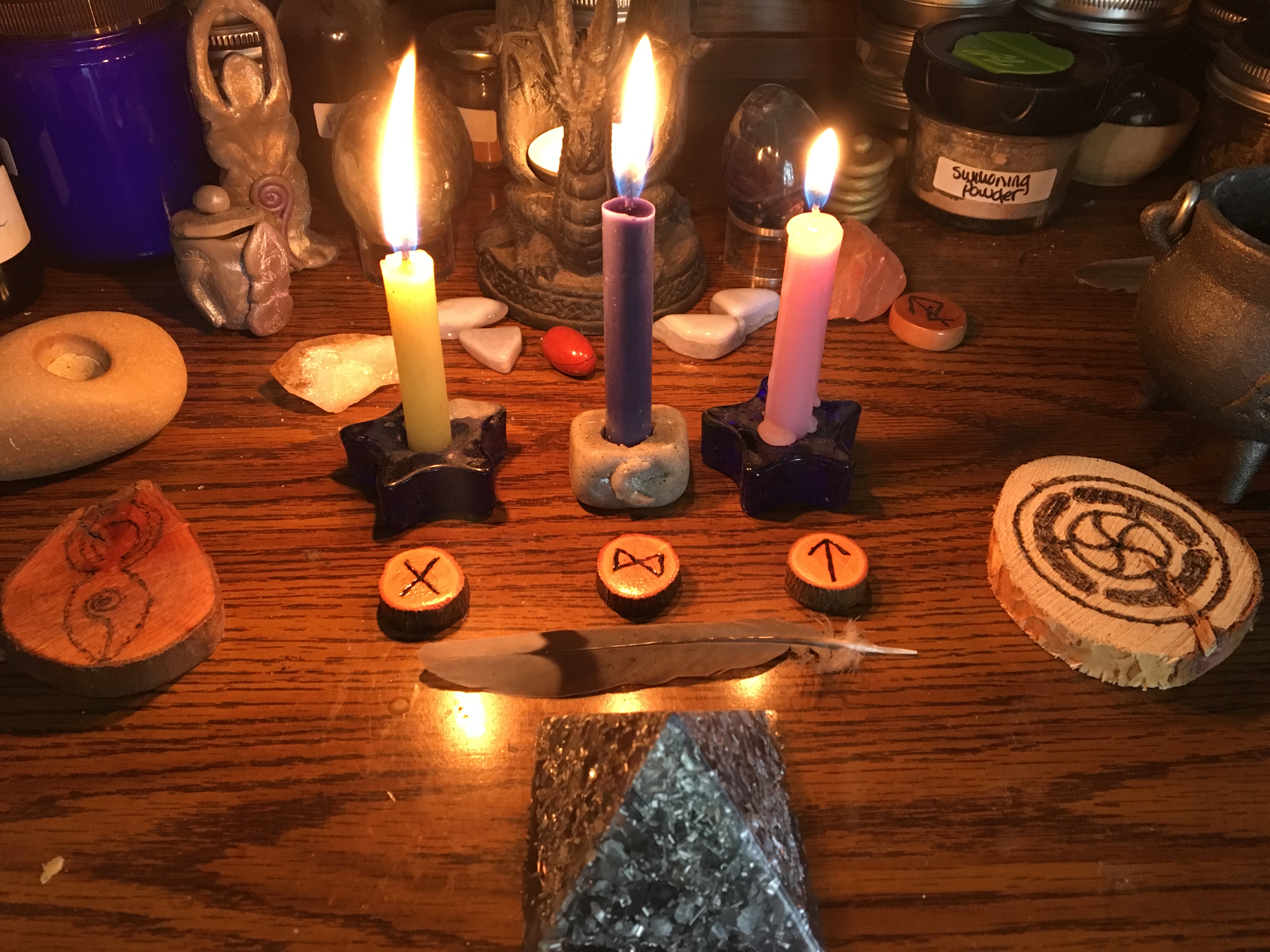 This can be performed on any day, but I did this one on Sunday to bring energy and vitality to the working. Because I want to improve communication, I chose three candles, yellow for communication, blue for emotional and astral support, and pink for love and peace. Additionally, because I work with runes, I drew three to place in front of each candle: Gebo, Dagaz, and Tiwaz. I allow the runes themselves to choose which I will place on the altar, drawing them from the bag without looking at them. Gebo represents balanced energy exchange which supports communication well. Dagaz represents enlightenment, awakening, along with beginnings and endings. The third rune, Tiwaz, represents justice and right thinking, adding a higher self focus to influence. You never know what counsel the runes will bring so I don’t get involved in their intentional selection.