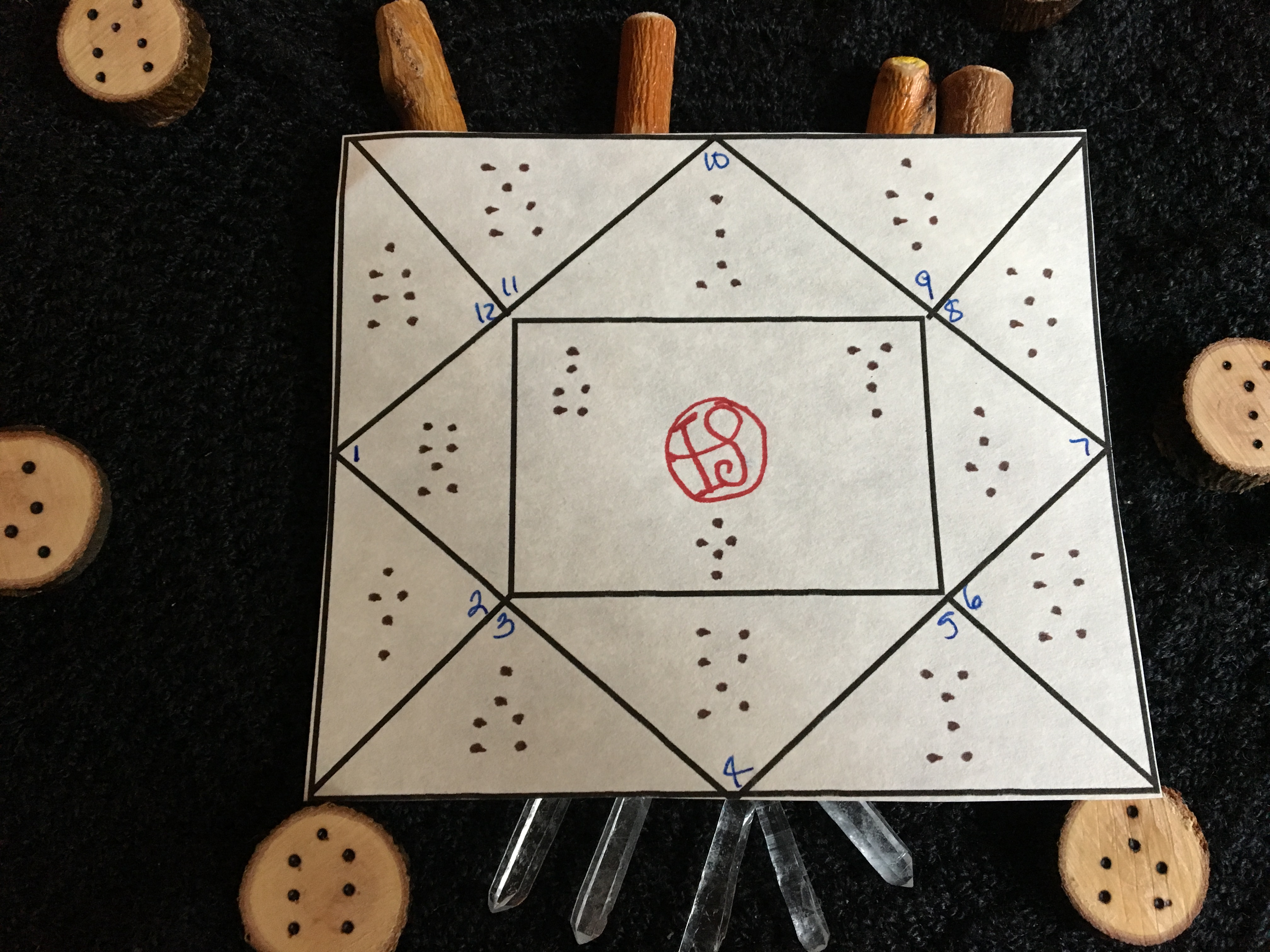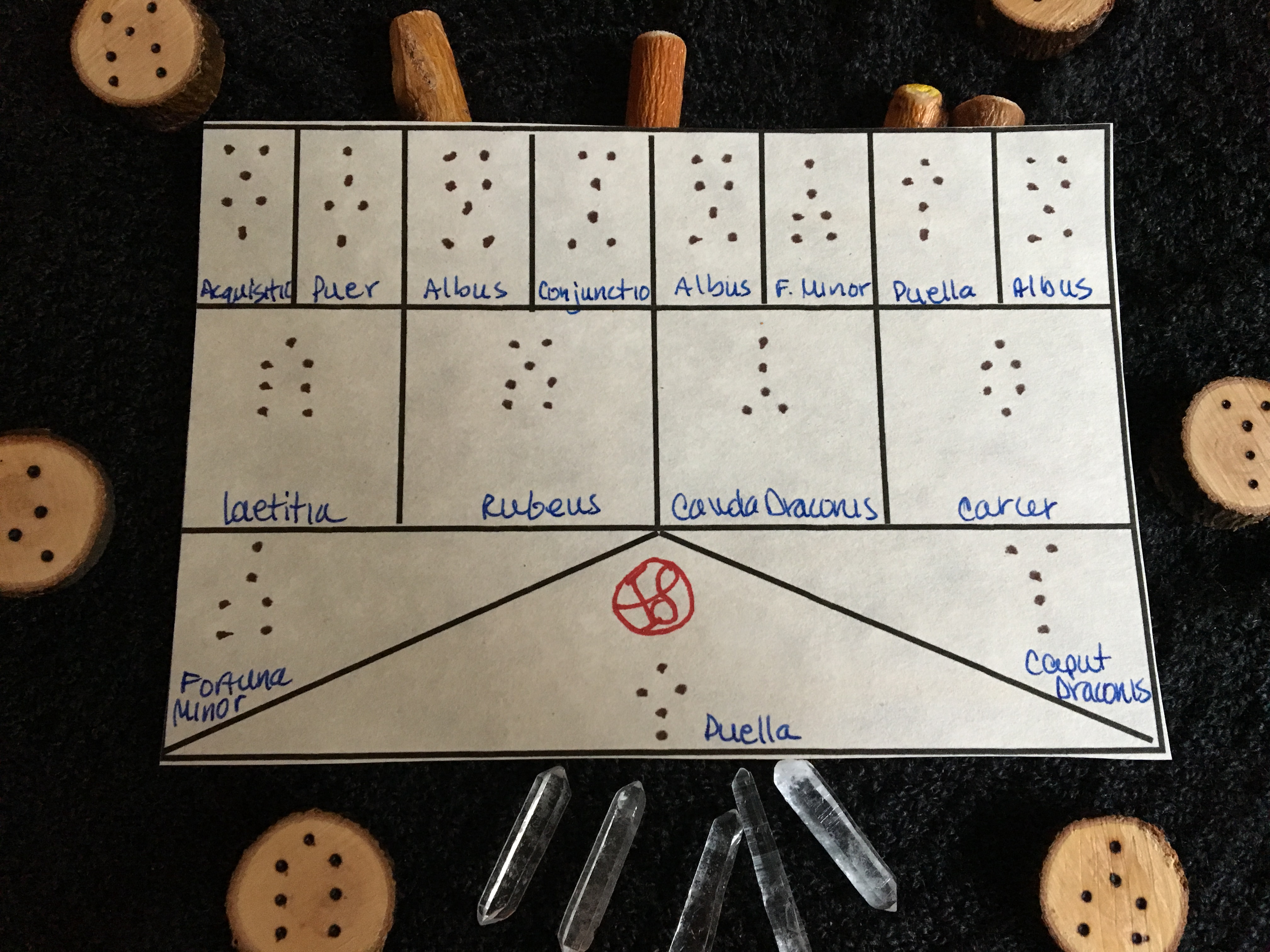 Four times the sticks are thrown and placed into their elemental order to create each geomantic pattern or figure. The remainder of the chart is created from those first four patterns. The first twelve patterns can be placed in the twelve houses of the zodiac and interpreted from that perspective in addition to looking at the Witnesses and the Judge, the final three patterns created. In a sense, geomancy involves the same type of reduction found in numerology, although not entirely. It’s binary in that we’re looking at one and two dots and then combining them with an odd number resulting in one dot and an even number resulting in two dots. A single dot represents energy which is active while two dots represent energy which is passive so you can get an initial idea of how the energy of each pattern invokes. Via, for example, which is a series of four single dots, indicates proactive energy and given that it represents street or way, it’s positive for upcoming journeys. Whereas, Populus, it’s counterpart, consists of four sets of two dots suggesting energy which is passive or receptive which makes sense given that Populus reflects the mood of the room, so to speak.