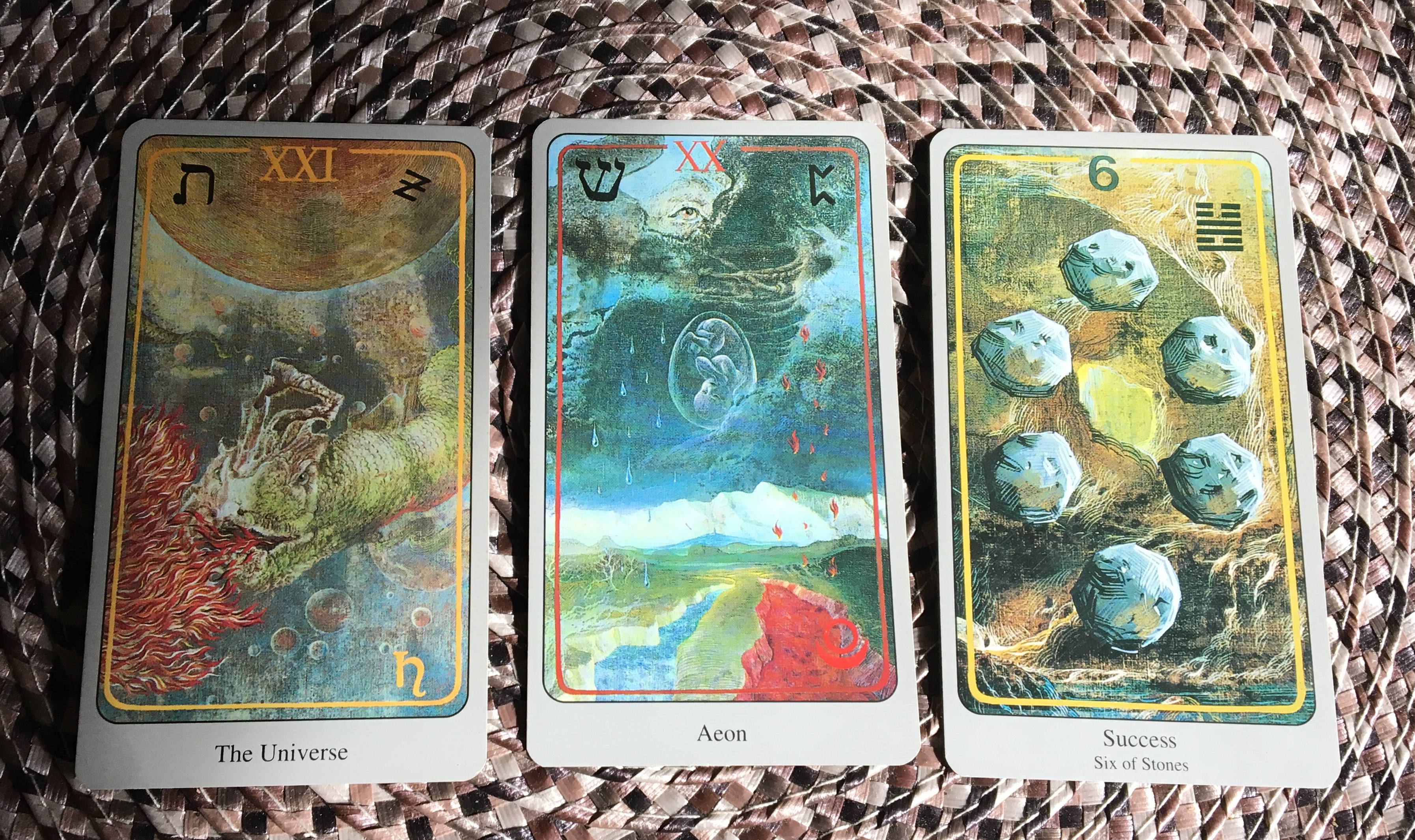 Haindl’s interpretation of The Universe is amazing. The serpent breathes fire into creation while planets hang suspended, bound by the fabric of space/time. A card from the Major Arcana, its numerology is three, or triple aspects, unification, and wholeness. It represents our journey’s end and the sum total of our experiences in form. In a sense, ours is a journey back to wholeness or remembrance of the totality of Self. Haindl includes Gebo, the rune of balanced energy exchange, up on the top right corner suggesting as above, so below, or a balanced blending of our nonphysical aspect of Self with our physical form.
