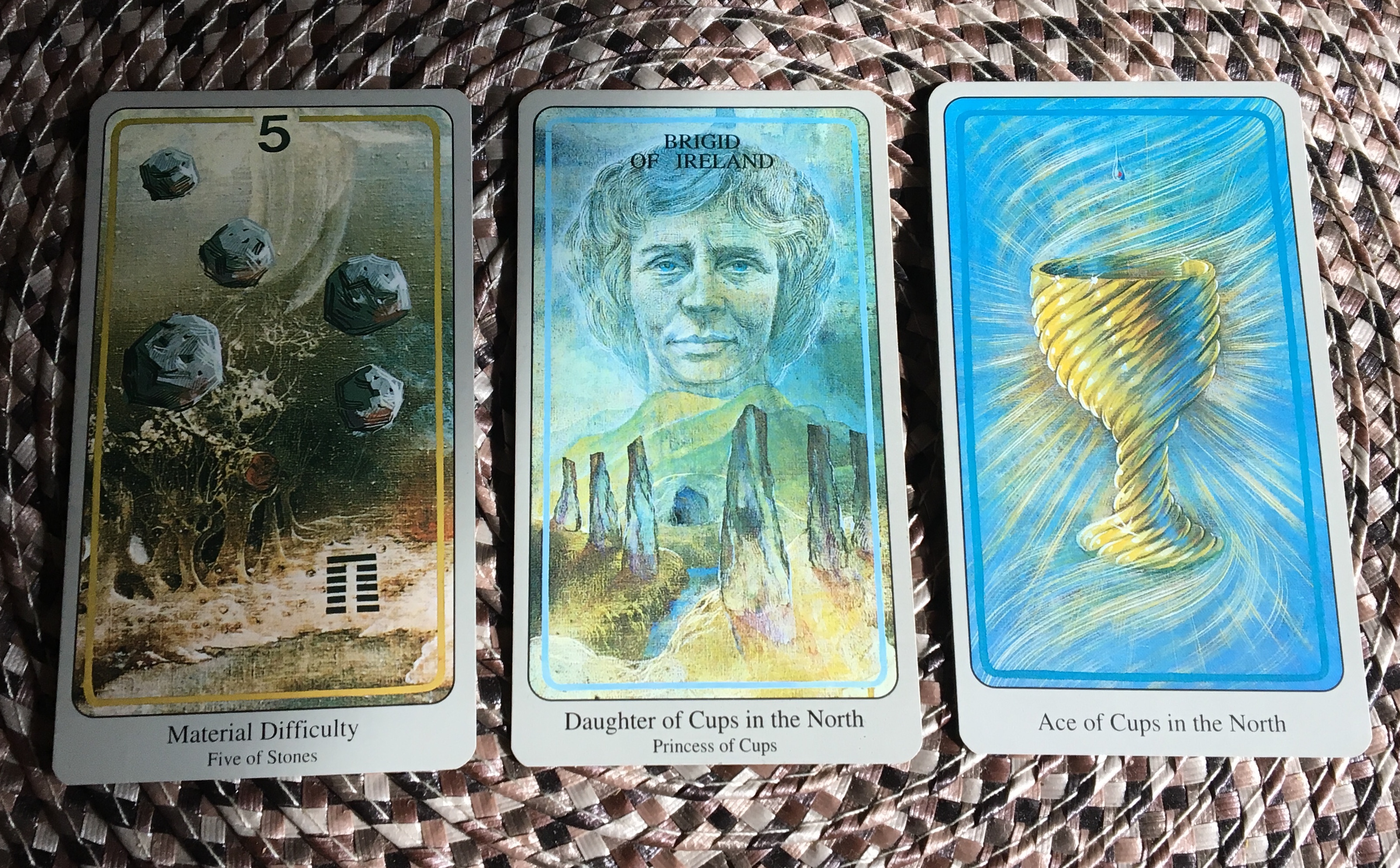 Haindl takes a different focus with his Court cards using cultural icons and deities to represent the Pages/Princesses, Knights/Princes, Queens, and Kings. For the Princess of Cups, he uses Brigid of Ireland as the Daughter of Cups in the North. Six standing stones, three on either side of a small creek, stand tall while a mound appears in the background, a rudimentary opening visible. Brigid was a Celtic Goddess, eventually given sainthood by the Catholic Church as was typical as paganism gave way to Christianity. I’m assuming Haindl chose her for this card because she never married, giving herself instead to the Church. Like the Princess of Cups, Brigid was practical and studious, and as savvy as they came and she would become venerated as one of Ireland’s most cherished patron saints. In the position of what challenges us this week, the Princess of Cups asks us to make productive use of our undeveloped potential.