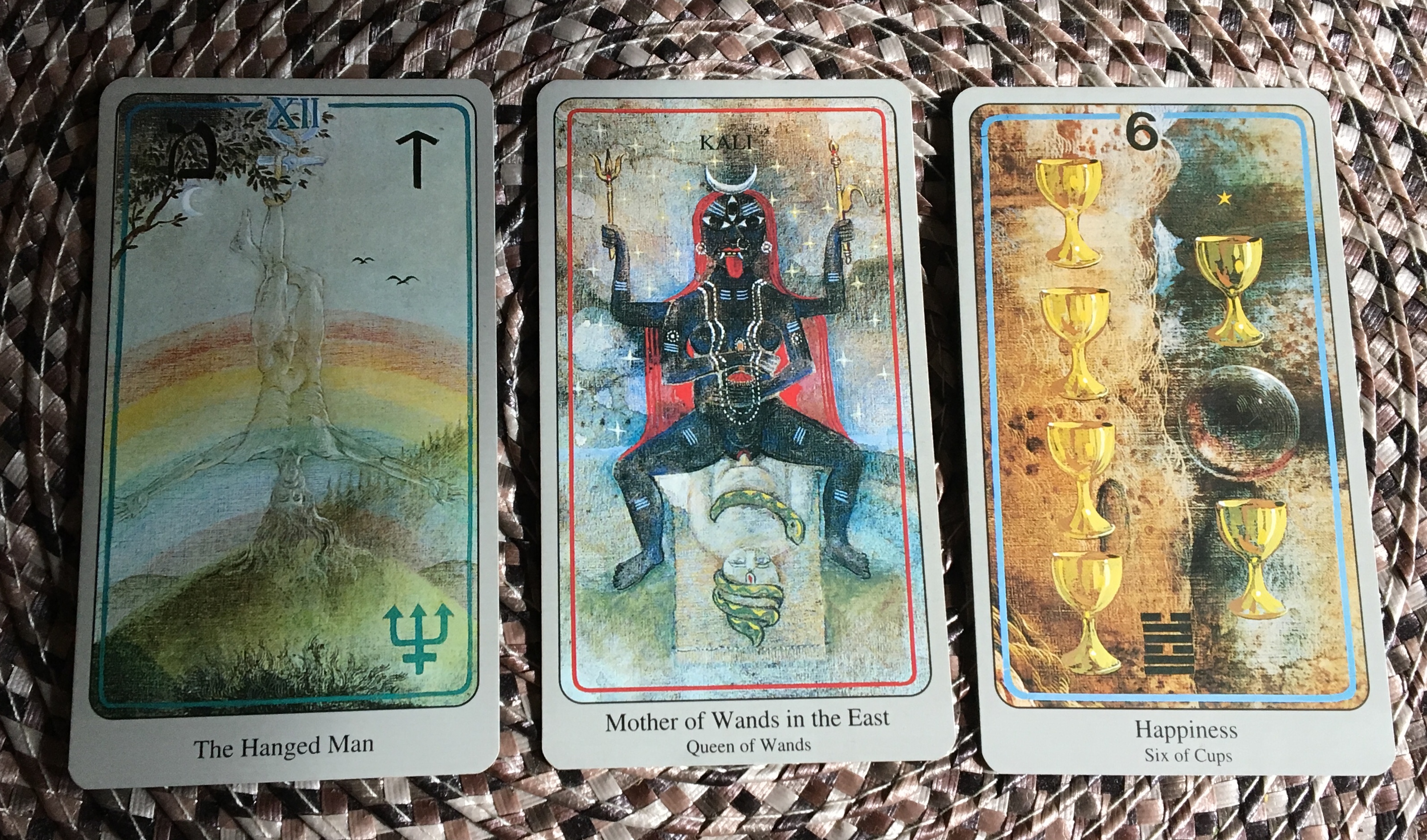 Haindl depicts the Queen of Wands as Kali, consort to Shiva, representing the darkness from which form emerges. She is creation energy, both empowering and destructive and in the position of what challenges us this week, it may be that our destructive side may influence. The challenge may be to be mindful of what we create and to not allow our more fiery nature to overshadow generosity or affection for others.