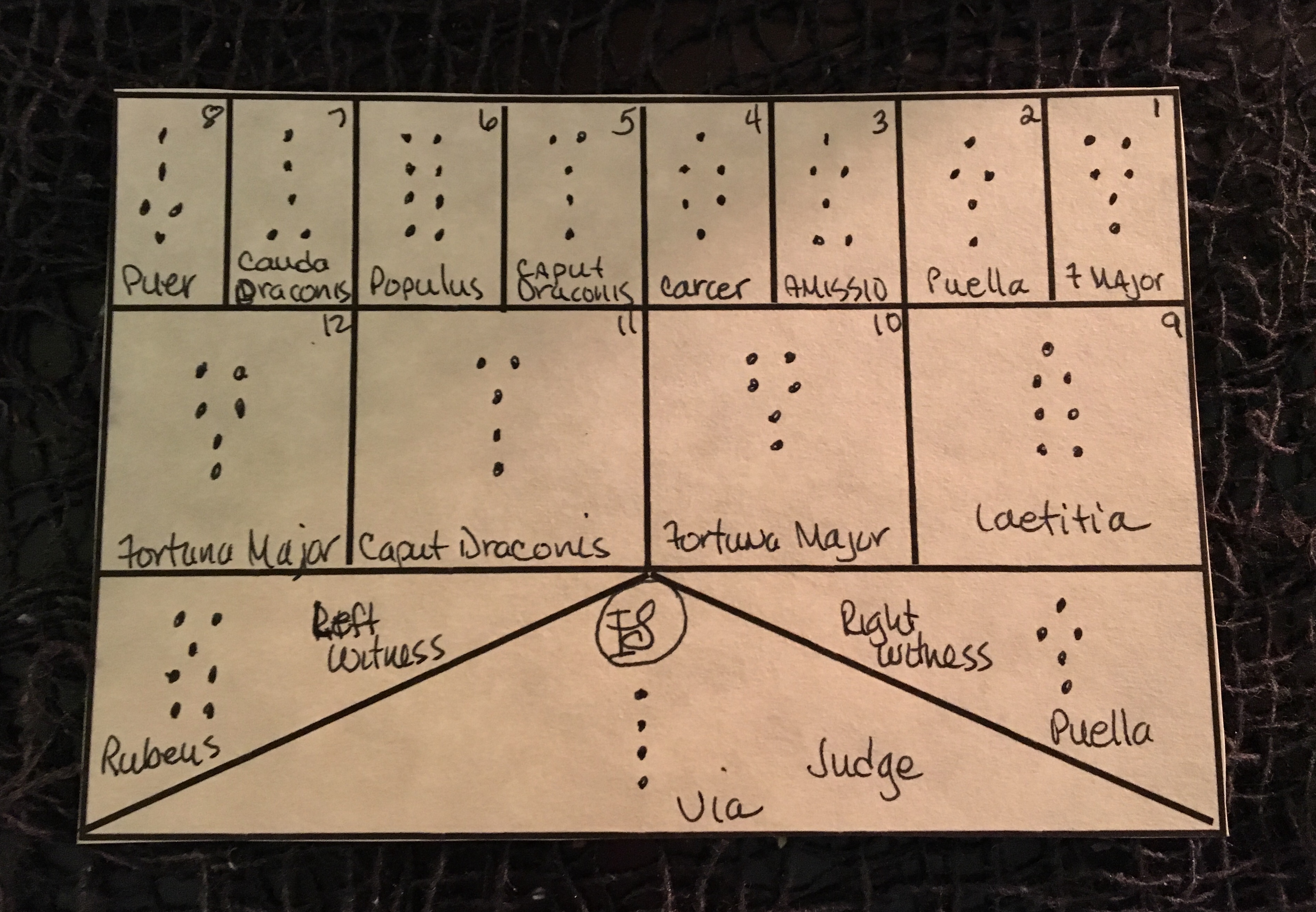 Although I’m not looking at the other symbols, before moving on to the Right and Left Witnesses I wanted to note an interesting pattern. Looking at sections 3 and 4 we have Carcer and Amissio, both considered negative geomantic influences. But they combine to create Fortuna Major in section 10, a really positive influence. We see this again in sections 7 and 8 with Cauda Draconis and Puer. Cauda Draconis, unlike Caput Draconis, is also considered an evil influence, while Puer or boy may indicate a lack of impulse control, but combined together, we have a positive outcome again with Fortuna Major in section 12 so this tells me that we’re processing these negative experiences or influences and transmuting them into something positive.