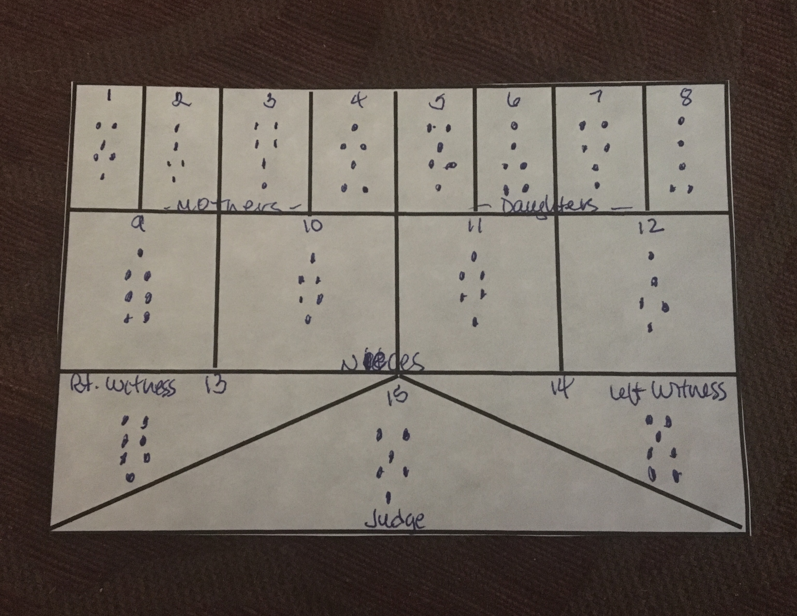 I again chose Sorath as the planetary spirit governing the divination and his sigil appears in the center of the House chart. Sorath governs the sun, leadership skills, power and authority, healing, and balance and I either use his or Taphthartharath’s sigil, the planetary spirit for Mercury and messages. Using Agrippa’s method, the general chart reads from left to right instead of the reverse process used by other geomancers, however, the symbols do not transfer into the corresponding Houses, instead following Agrippa’s own perspective found in Franz Hartmann’s Geomancy: A Method of Divination.