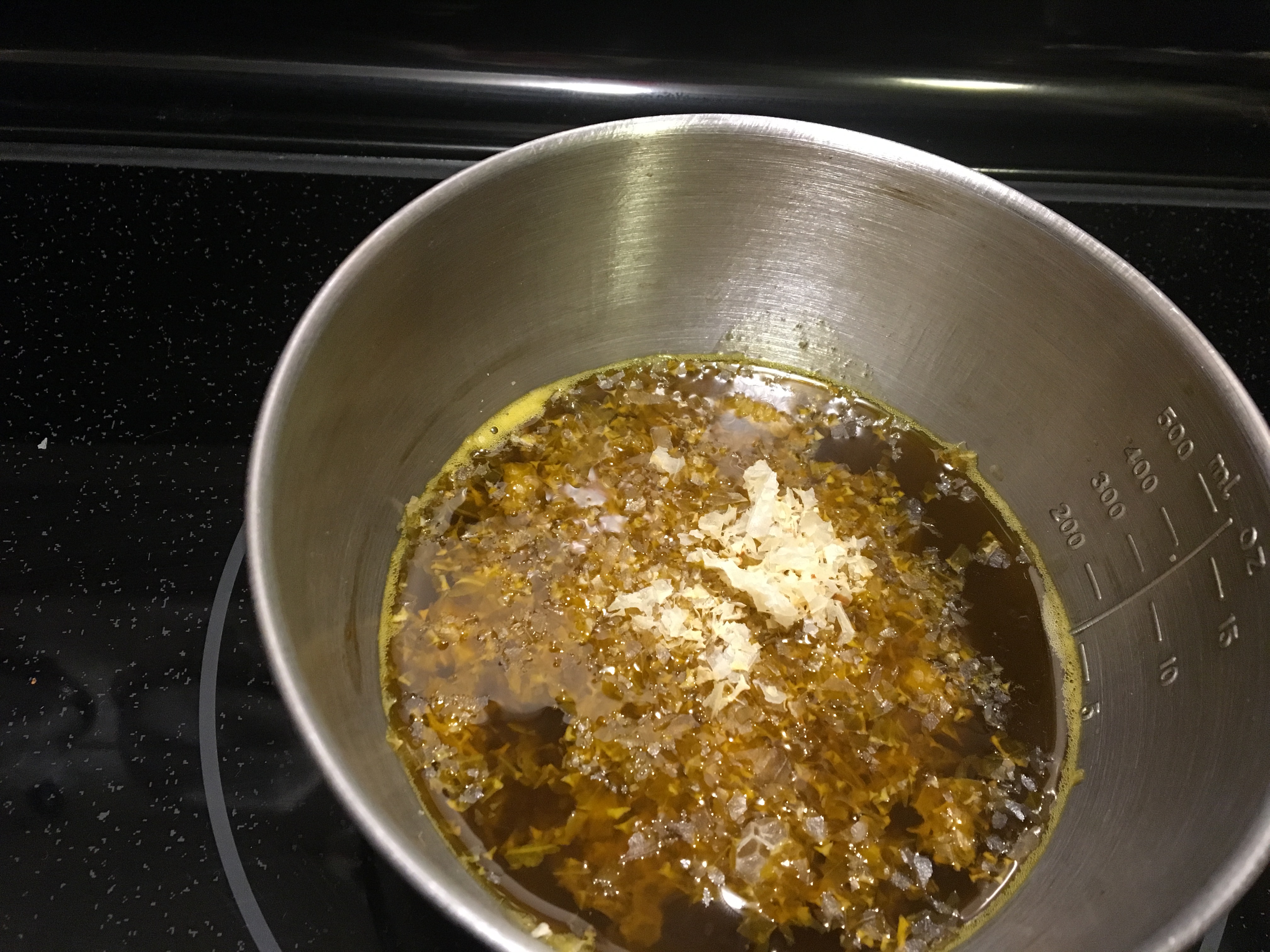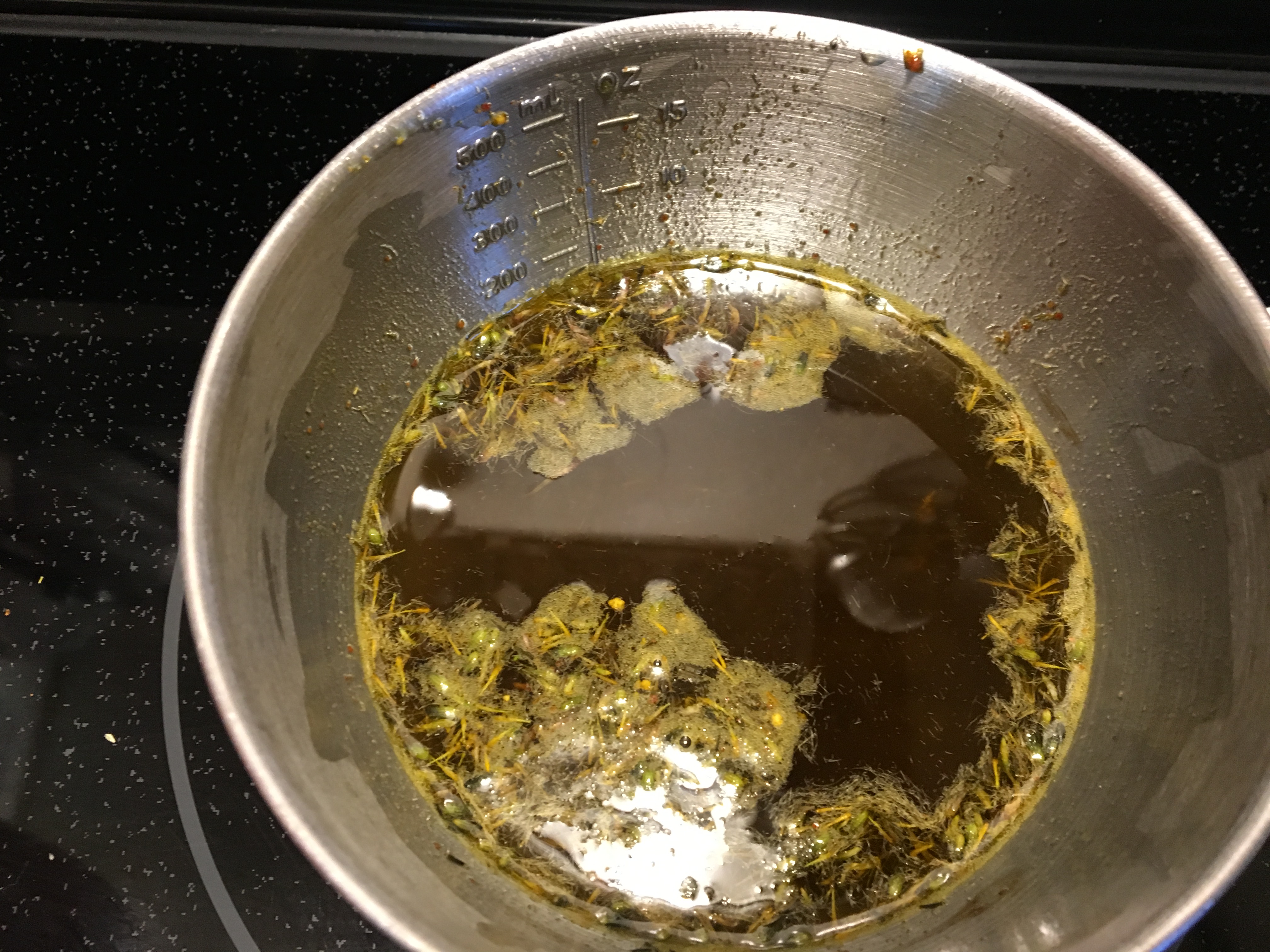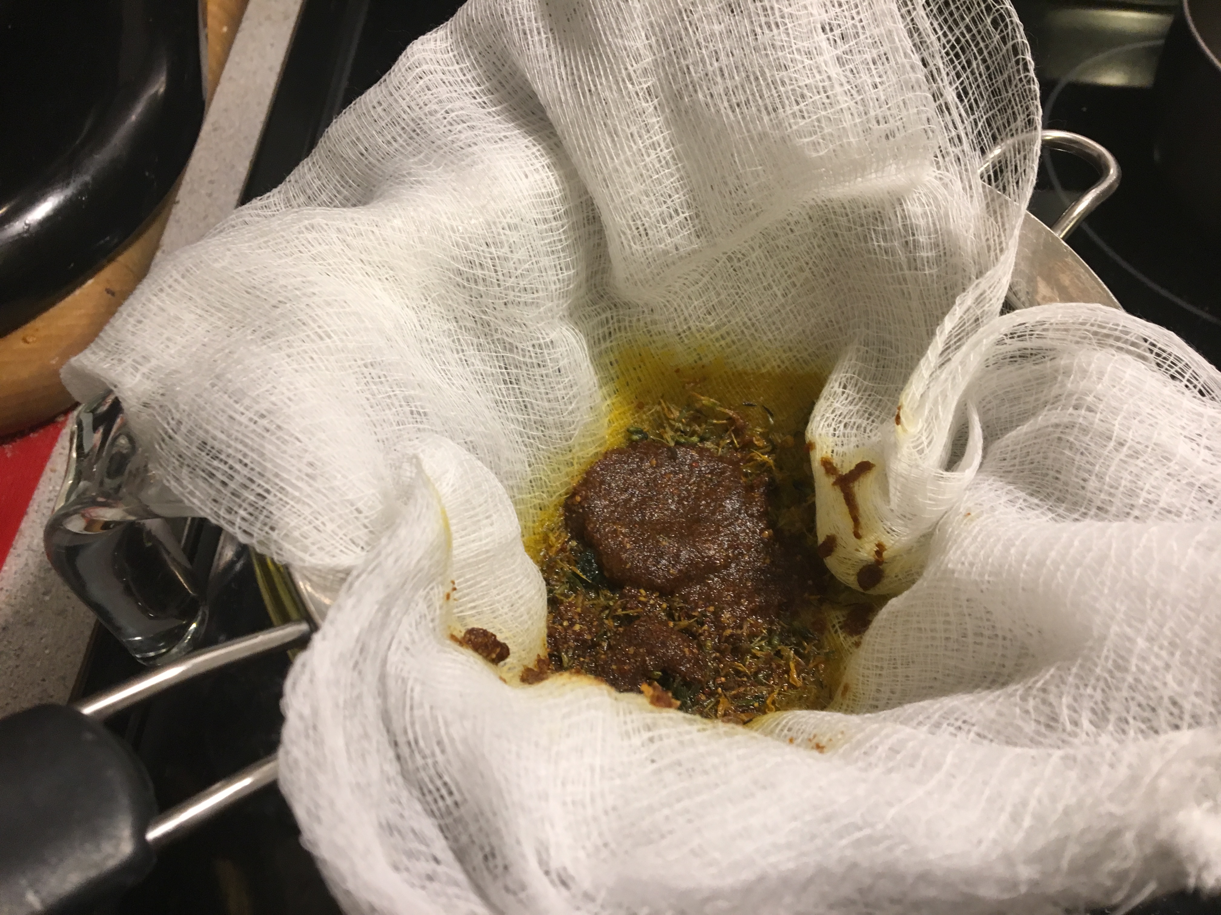 I began by melting the cannabis infused coconut oil in a small pan on the warmer burner after which I began adding the herbs. I covered the pan with foil and let the herbs infuse on the burner on low heat between three and four hours. I had to run to the store for the turkey, so I turned it off while I was gone, but overall, it was probably around four hours of infusion. After infusing, I lined a fine mesh strainer with cheesecloth and then poured the mixture over it into a clean pyrex container and then poured the infused oil back into the pan to add beeswax. I added the beeswax and allowed it to melt, stirring it a bit to break up the crushed beeswax comb.
