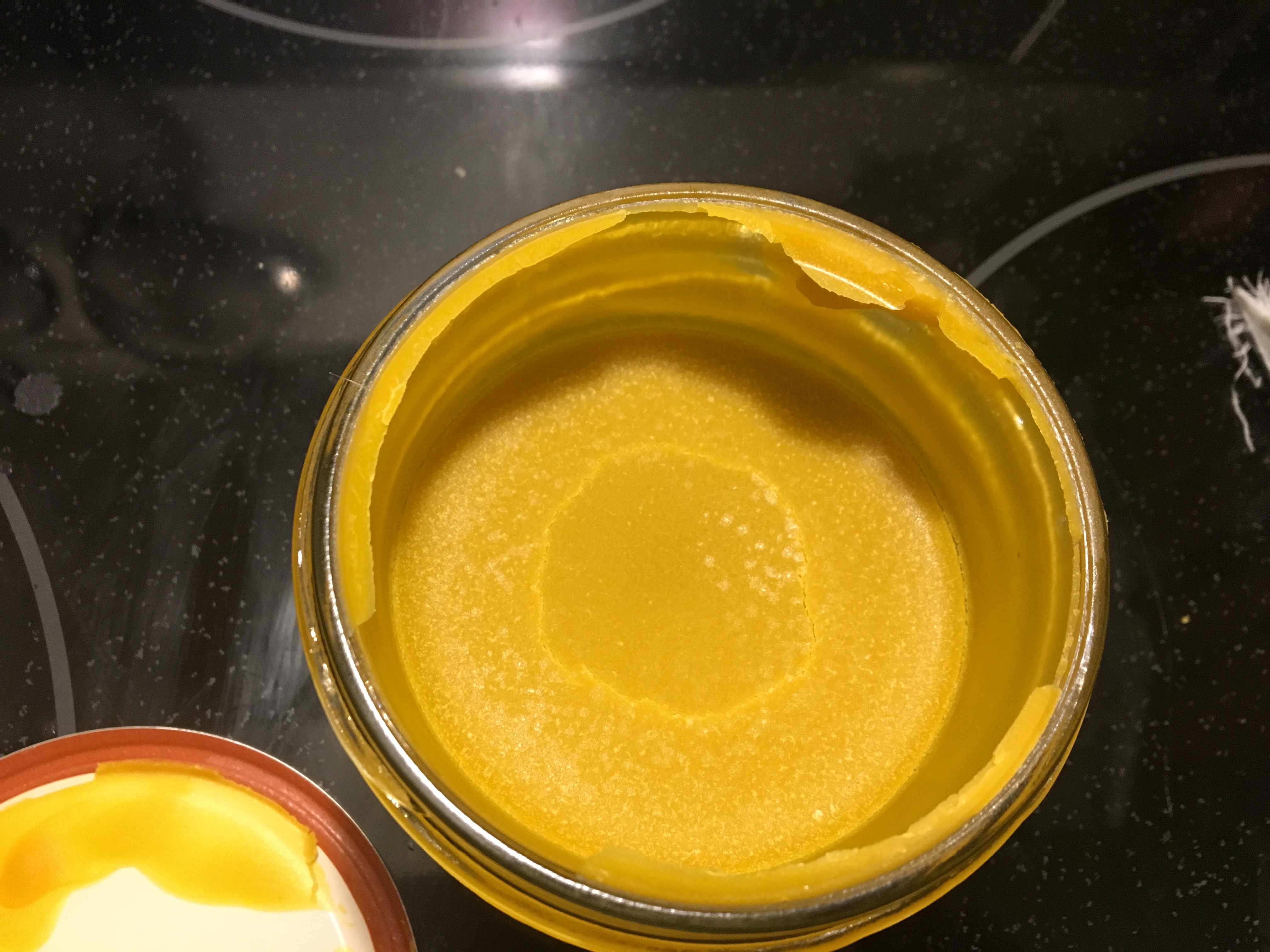 I love making herbal oils and salves. For this one, I’m using a cannabis infused coconut oil base and adding dried arnica and lavender blossoms along with some turmeric powder and a blend of Thai and cayenne pepper. The beeswax I’ll use is from our beehives so that’s awesome.