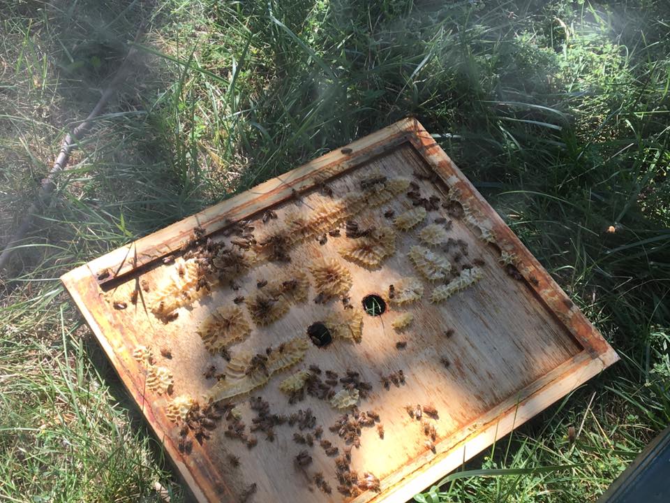 Hive B was calmer this time because the errant queen had already swarmed. Why another one did as well is a mystery, but I’m so glad she did. Five hives in the apiary are awesome! There was a bunch of burr comb to deal with on both hives but other than that, we didn’t pull any frames, particularly on this hive. We didn’t want to disturb any queen activity in there so we added some frames and closed it back up.